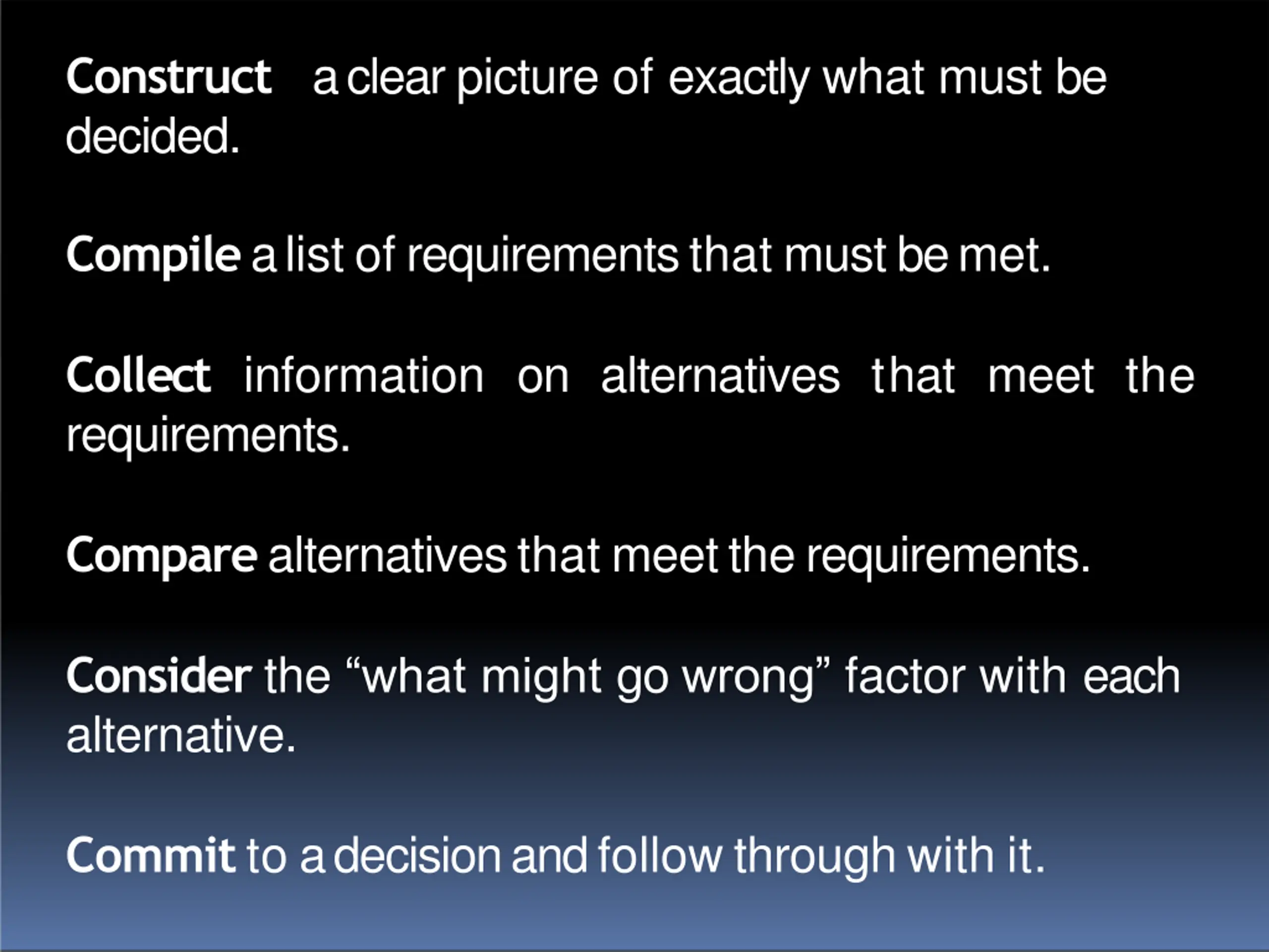 a clear picture of exactly what must be Construct decided. Compilealist of requirementsthat mustbemet. Collect information on alternatives that meet the requirements. Comparealternativesthat meettherequirements. Consider the what might go wrong factor with each alternative. Committo adecisionandfollow throughwith it.