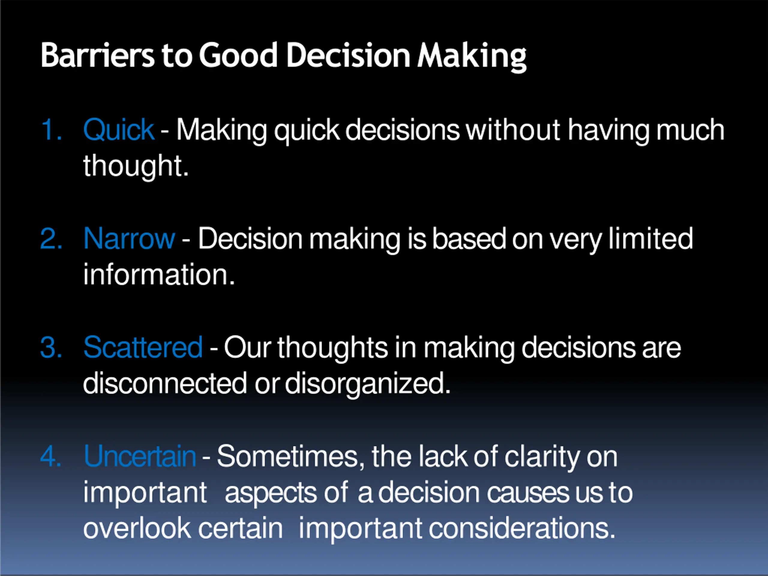 BarrierstoGoodDecisionMaking 1. Quick-Makingquickdecisionswithout havingmuch thought. 2. Narrow-Decisionmakingisbasedonverylimited information. 3. Scattered-Ourthoughtsinmakingdecisionsare disconnected ordisorganized. 4. Uncertain-Sometimes,thelackof clarityon important aspects of a decision causes us to overlook certain importantconsiderations.