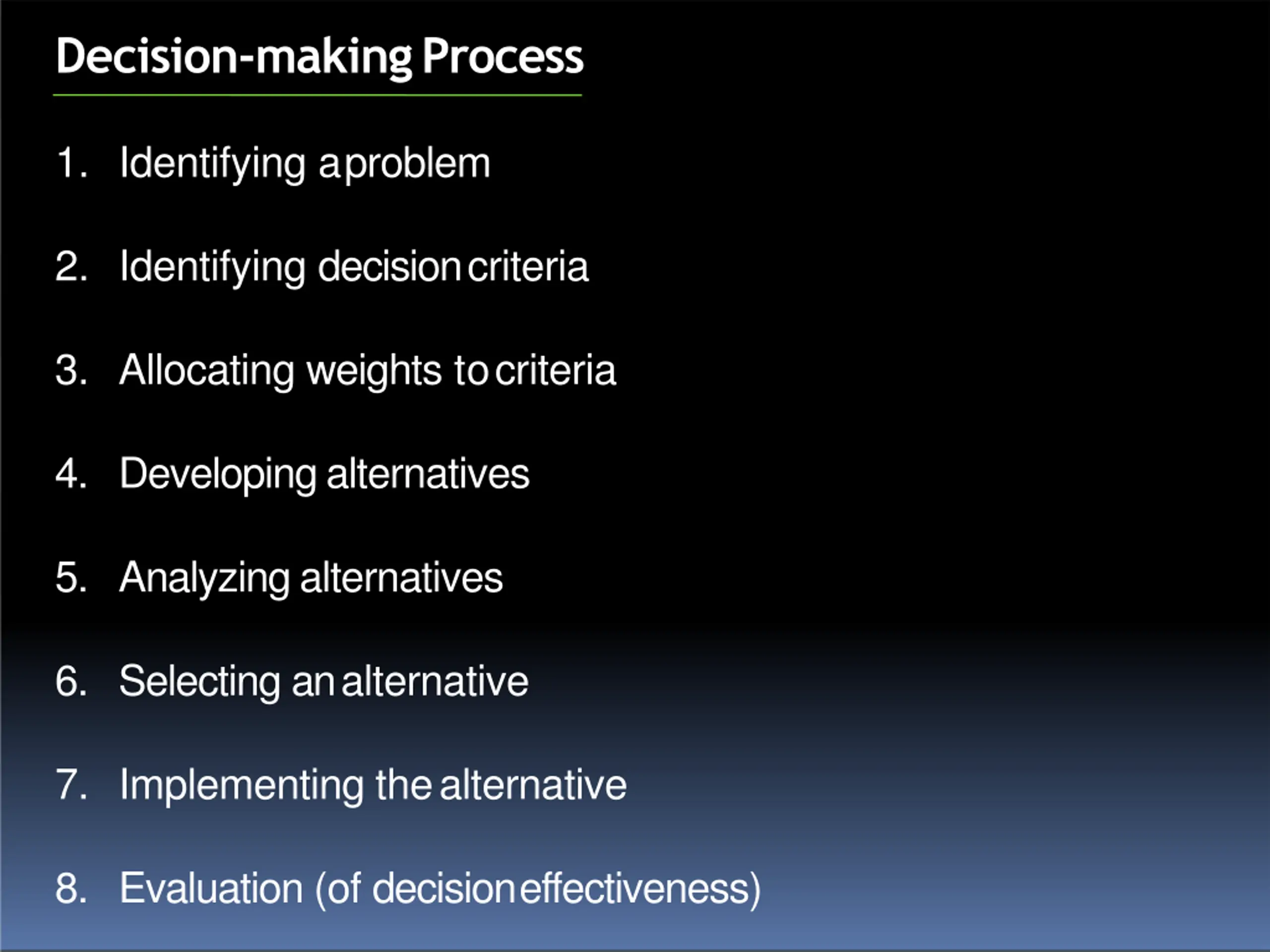 Decision-makingProcess 1. Identifying aproblem 2. Identifying decisioncriteria 3. Allocating weights tocriteria 4. Developingalternatives 5. Analyzingalternatives 6. Selecting analternative 7. Implementing thealternative 8. Evaluation (of decisioneffectiveness)