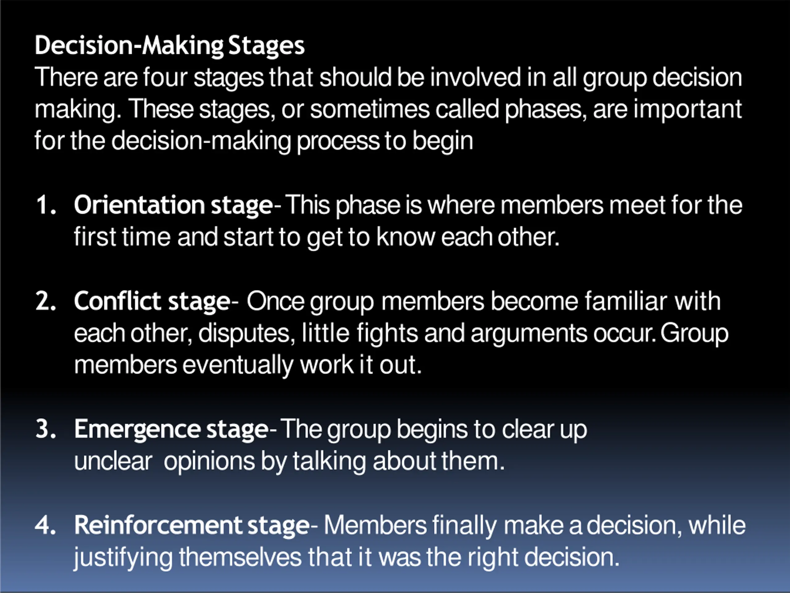 Decision-MakingStages Therearefour stagesthat shouldbeinvolvedinallgroupdecision making.Thesestages,or sometimescalledphases,areimportant forthedecision-makingprocessto begin 1. Orientationstage-Thisphaseiswheremembersmeetforthe firsttime andstartto getto knoweachother. 2. Conflict stage- Once group members become familiar with eachother,disputes,little fightsandargumentsoccur.Group memberseventually workit out. 3. Emergencestage-Thegroupbeginsto clearup unclear opinionsbytalking aboutthem. 4. Reinforcementstage-Membersfinally makeadecision,while justifyingthemselves that it wastheright decision.
