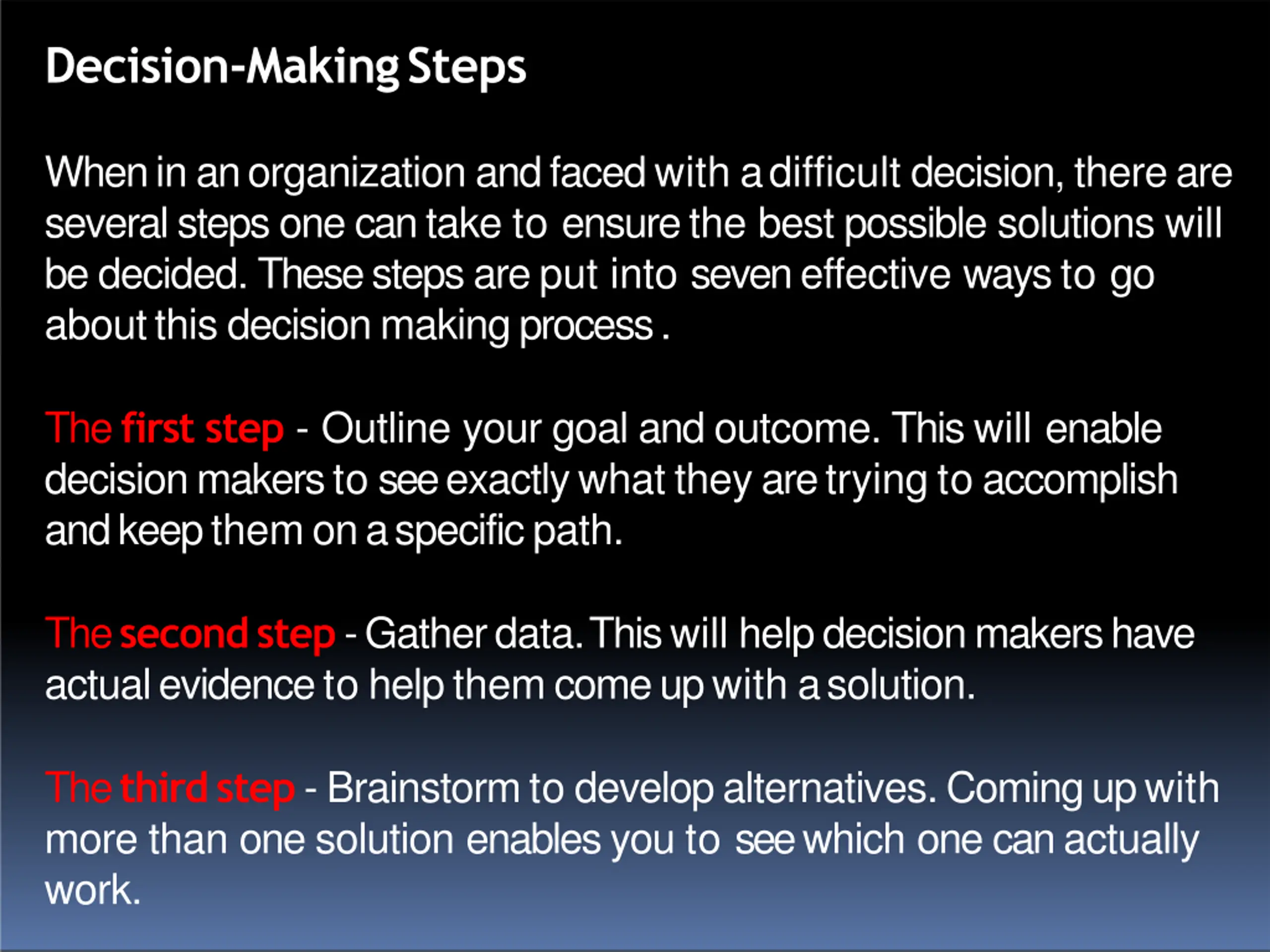 Decision-MakingSteps Wheninanorganizationandfacedwith adifficult decision,thereare several steps one can take to ensure the best possible solutions will be decided. These steps are put into seven effective ways to go aboutthis decisionmakingprocess. The first step - Outline your goal and outcome. This will enable decisionmakersto see exactlywhat theyaretrying to accomplish andkeepthemonaspecificpath. Thesecondstep-Gatherdata.Thiswill helpdecisionmakershave actualevidenceto helpthemcomeupwith asolution. Thethirdstep- Brainstormto developalternatives.Comingupwith more than one solution enables you to see which one can actually work.