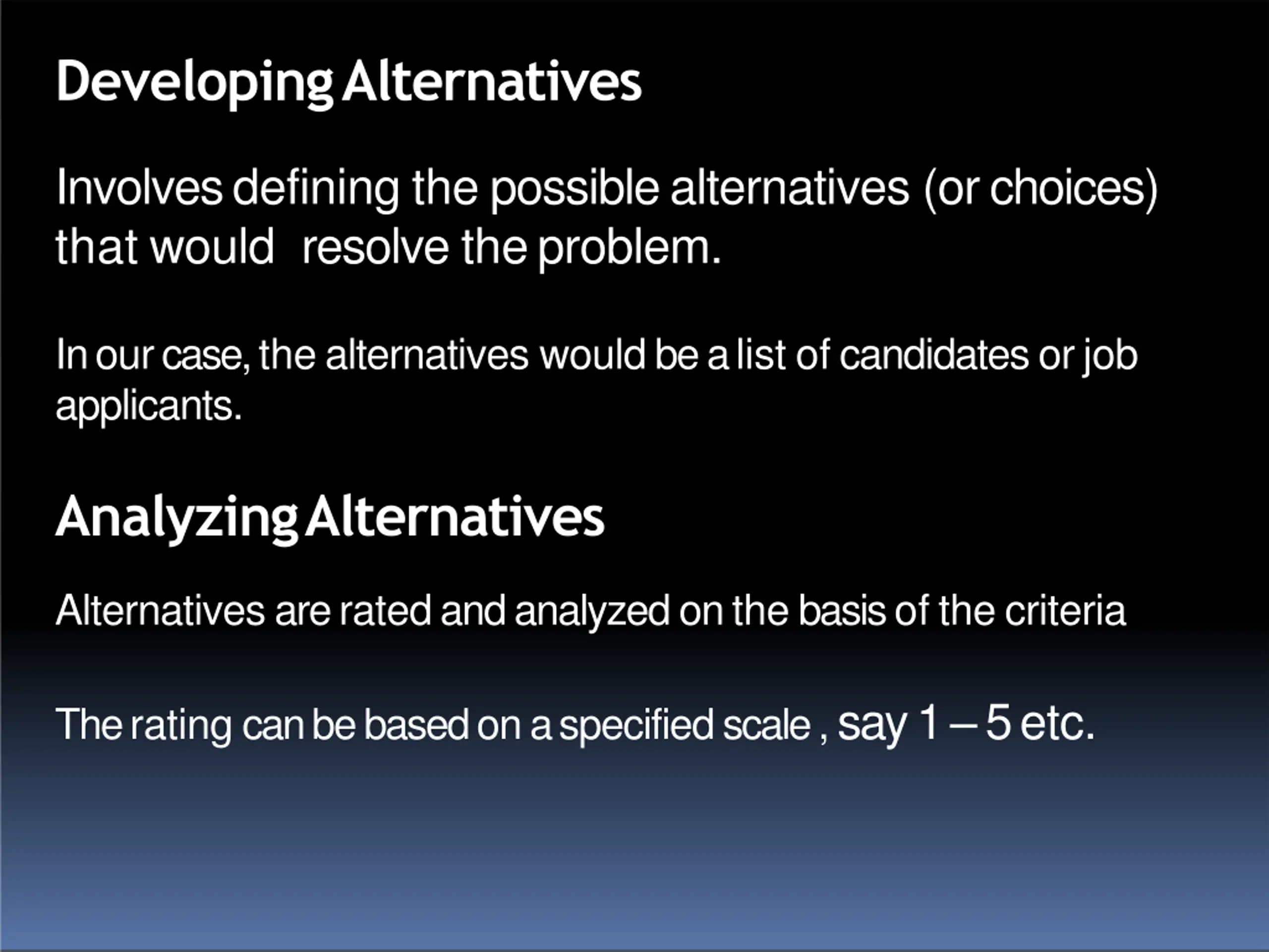 DevelopingAlternatives Involvesdefining the possiblealternatives (orchoices) that would resolve theproblem. Inourcase,thealternatives wouldbealist ofcandidatesorjob applicants. AnalyzingAlternatives Alternativesareratedandanalyzedonthebasisof thecriteria Therating canbebasedonaspecifiedscale,say1 5etc.