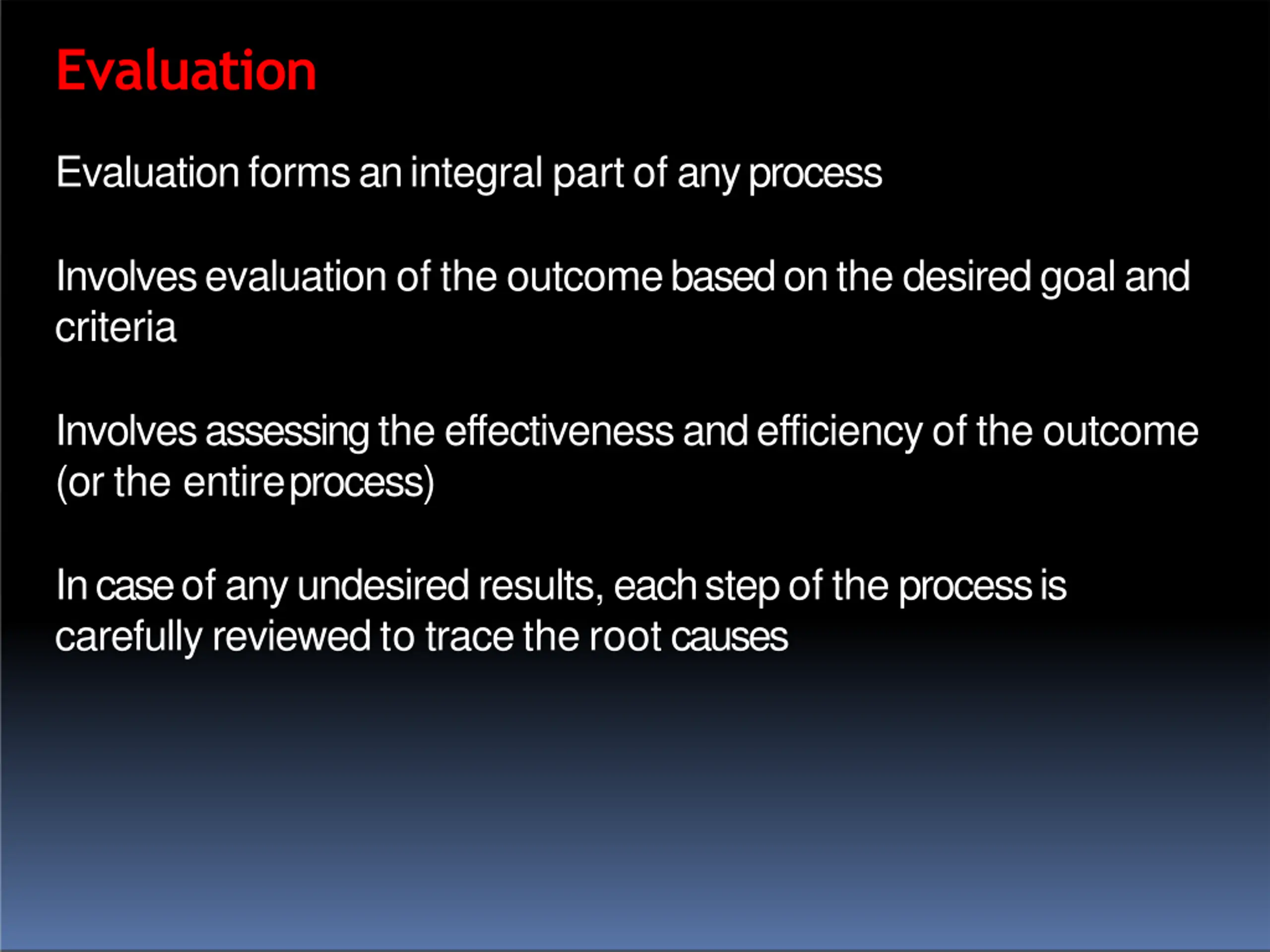 Evaluation Evaluationformsanintegral partof anyprocess Involvesevaluationof theoutcomebasedonthe desiredgoaland criteria Involvesassessingtheeffectivenessandefficiencyofthe outcome (or the entireprocess) Incaseofanyundesiredresults,eachstepofthe processis carefullyreviewedto tracetheroot causes