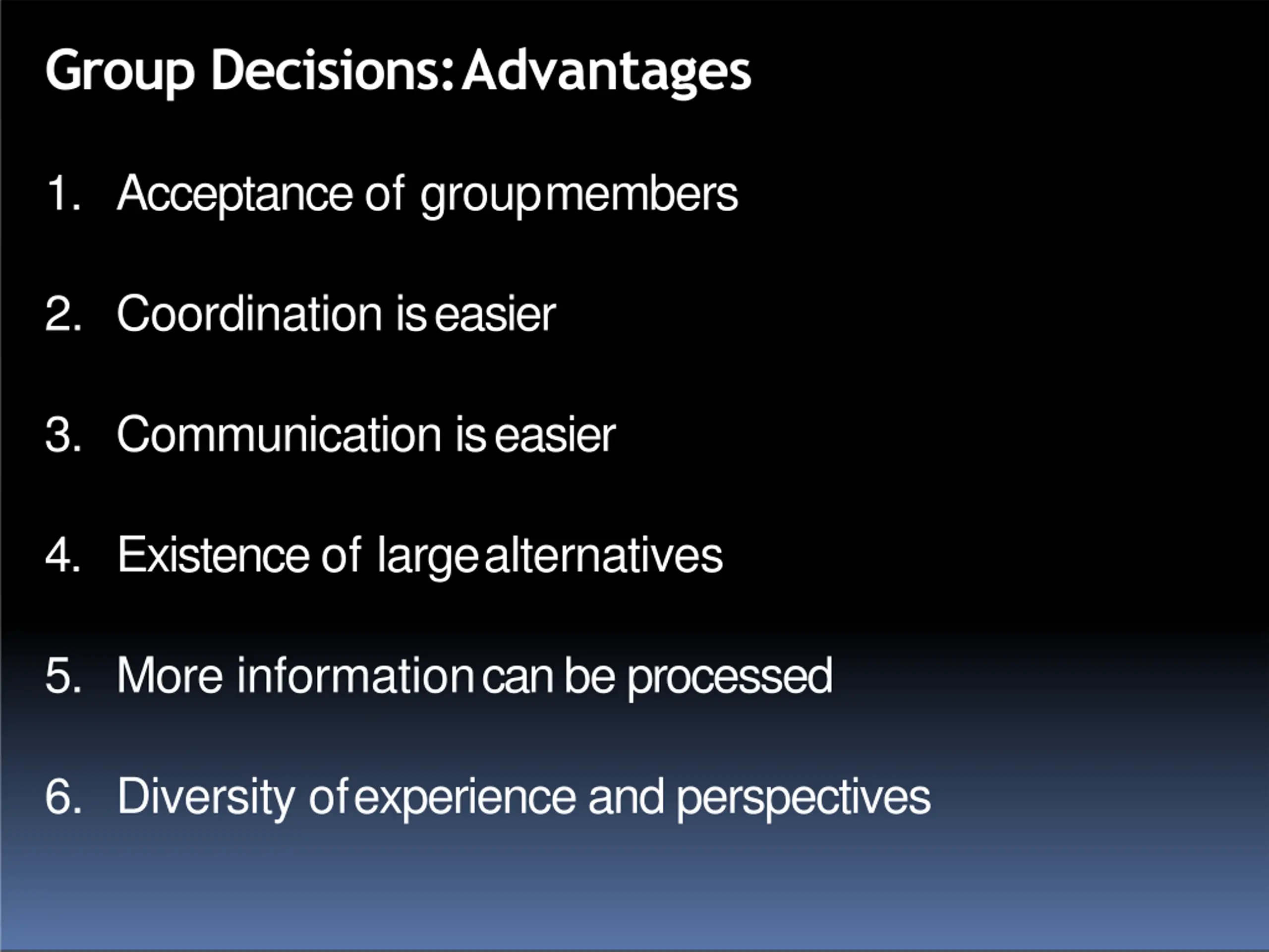 Group Decisions:Advantages 1. Acceptance of groupmembers 2. Coordination iseasier 3. Communication iseasier 4. Existence of largealternatives 5. More informationcan be processed 6. Diversity ofexperience and perspectives