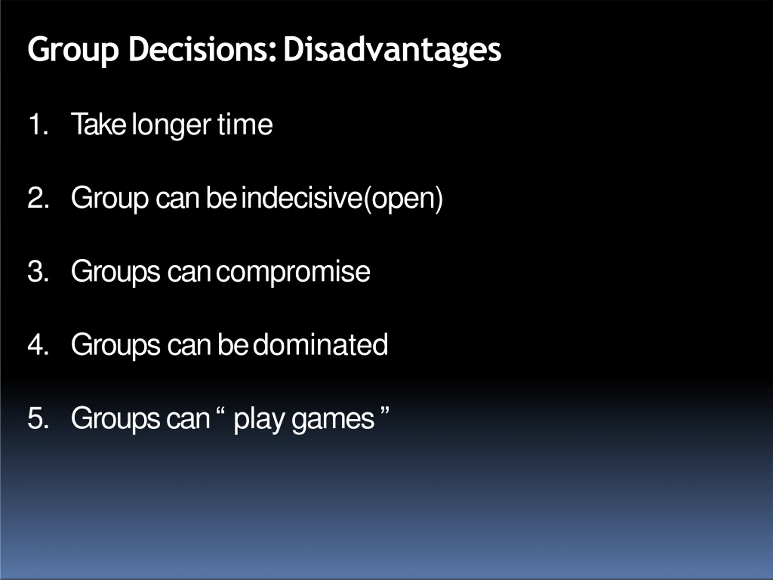 Group Decisions:Disadvantages 1. Take longertime 2. Group can beindecisive(open) 3. Groups cancompromise 4. Groups can bedominated 5. Groupscan playgames
