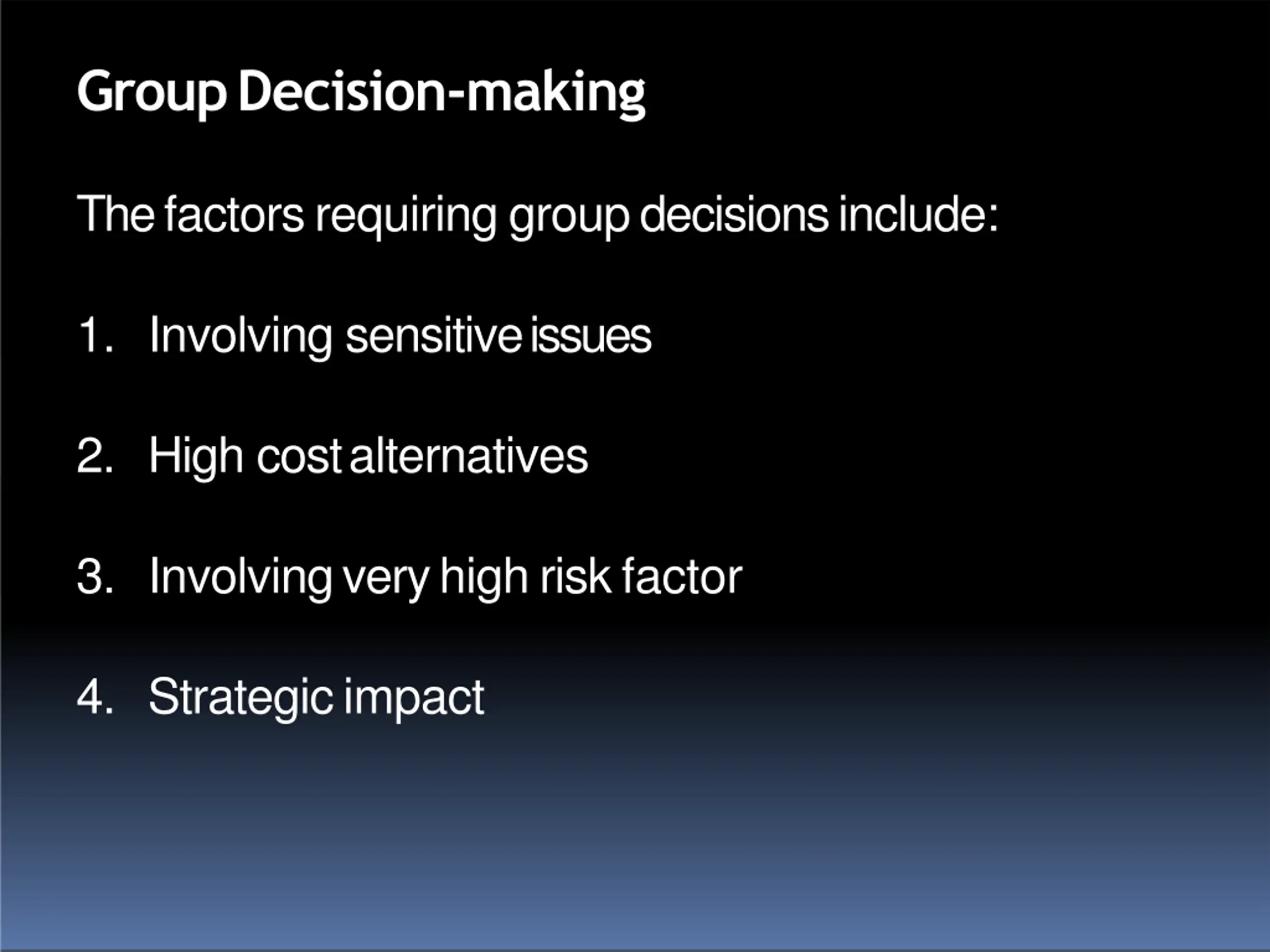 GroupDecision-making Thefactorsrequiring groupdecisionsinclude: 1. Involving sensitiveissues 2. High costalternatives 3. Involvingveryhighriskfactor 4. Strategicimpact