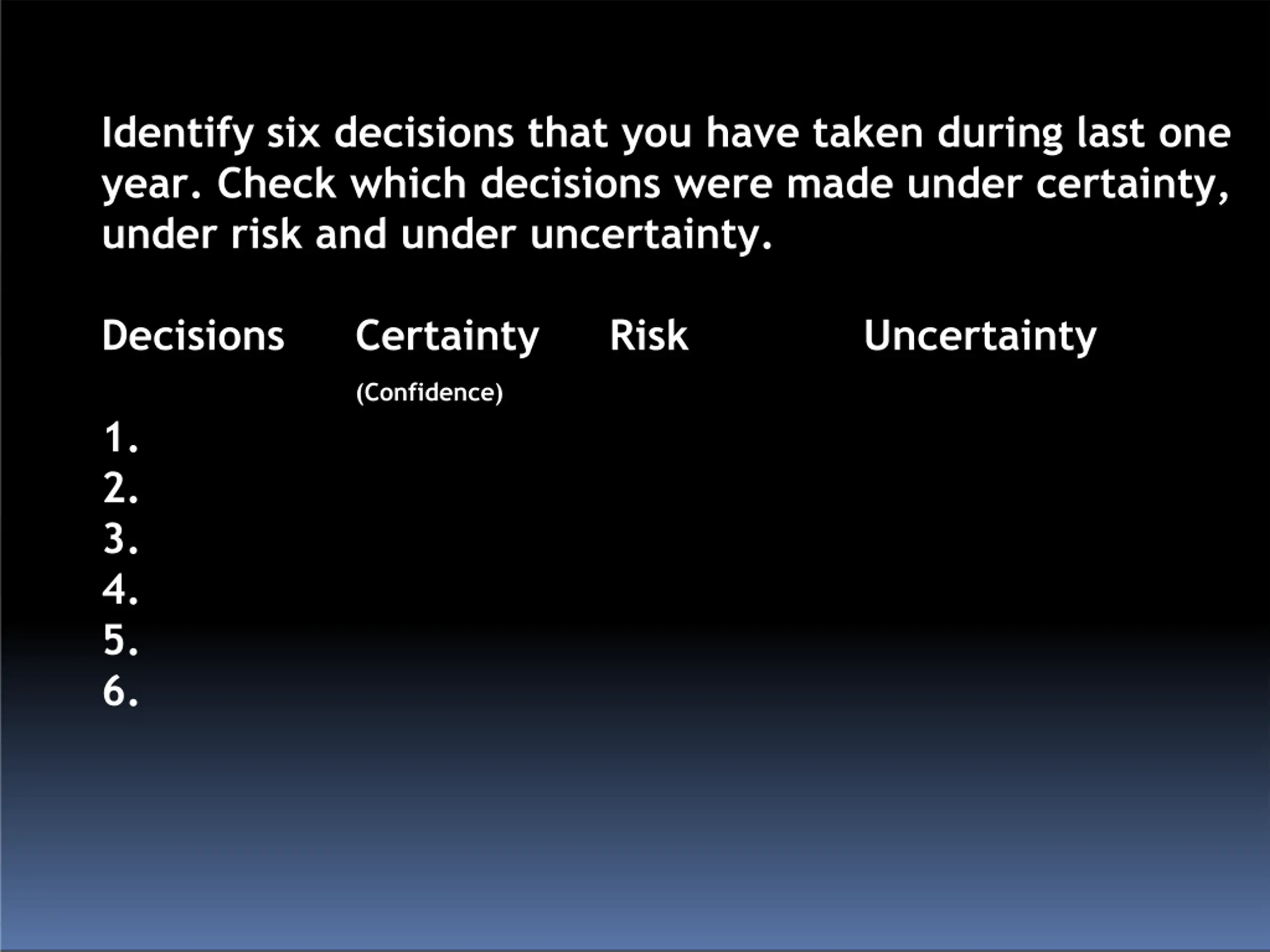 Identify six decisions that you have taken during last one year. Check which decisions were made under certainty, under risk and under uncertainty. Decisions 1. 2. 3. 4. 5. 6. Certainty Risk Uncertainty (Confidence)