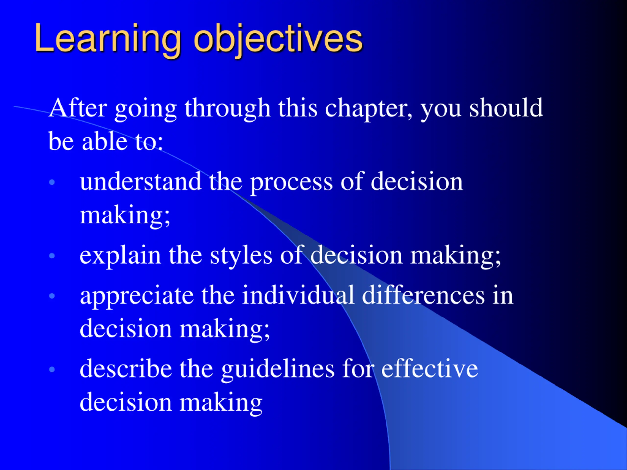 Learning objectives After going through this chapter, you should be able to: understand the process of decision making; explain the styles of decision making; appreciate the individual differences in decision making; describe the guidelines for effective decision making