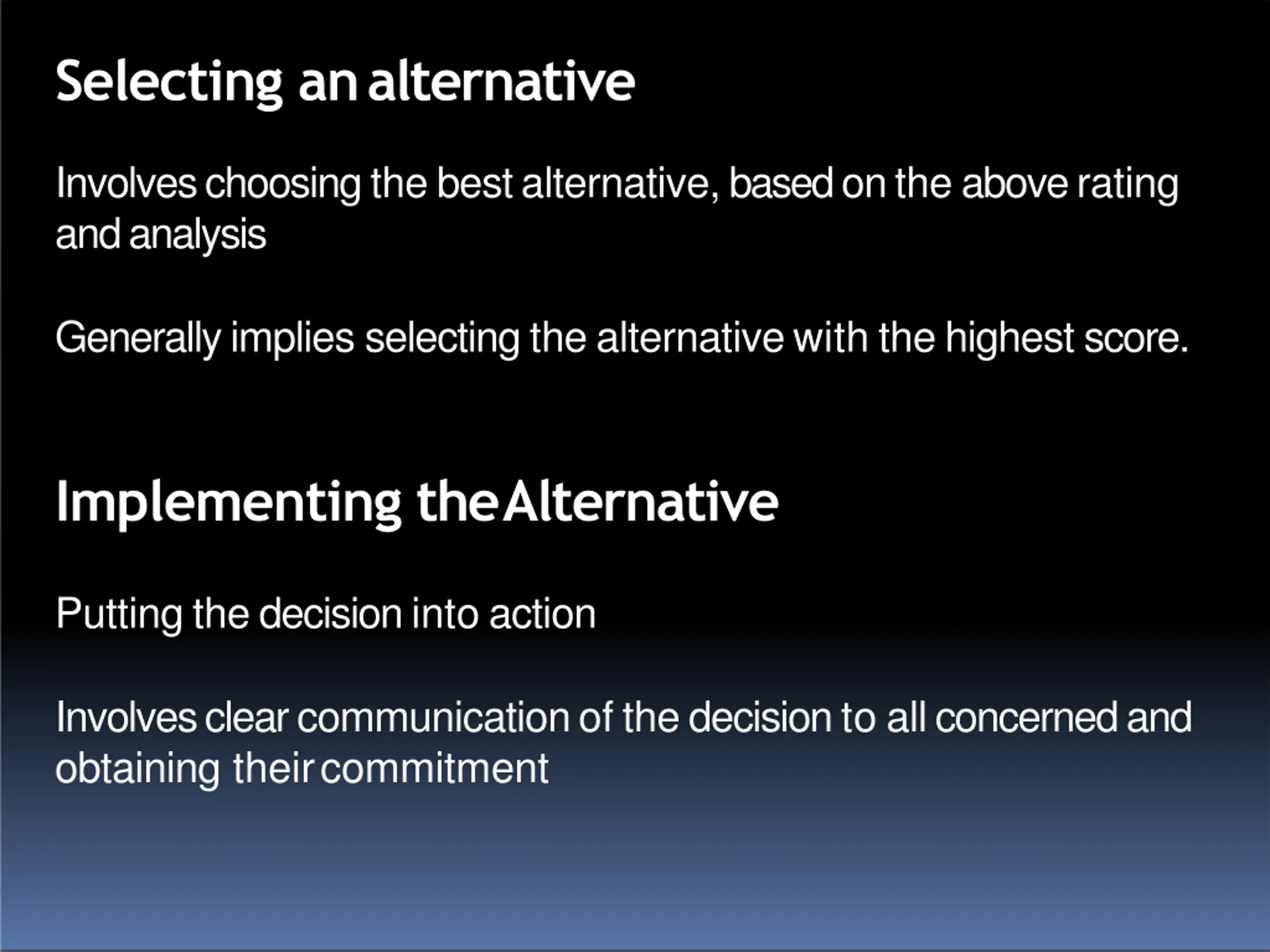 Selecting analternative Involveschoosingthebestalternative,basedontheaboverating andanalysis Generallyimplies selectingthealternativewith thehighest score. Implementing theAlternative Puttingthedecisioninto action Involvesclearcommunicationof thedecisionto allconcernedand obtaining theircommitment