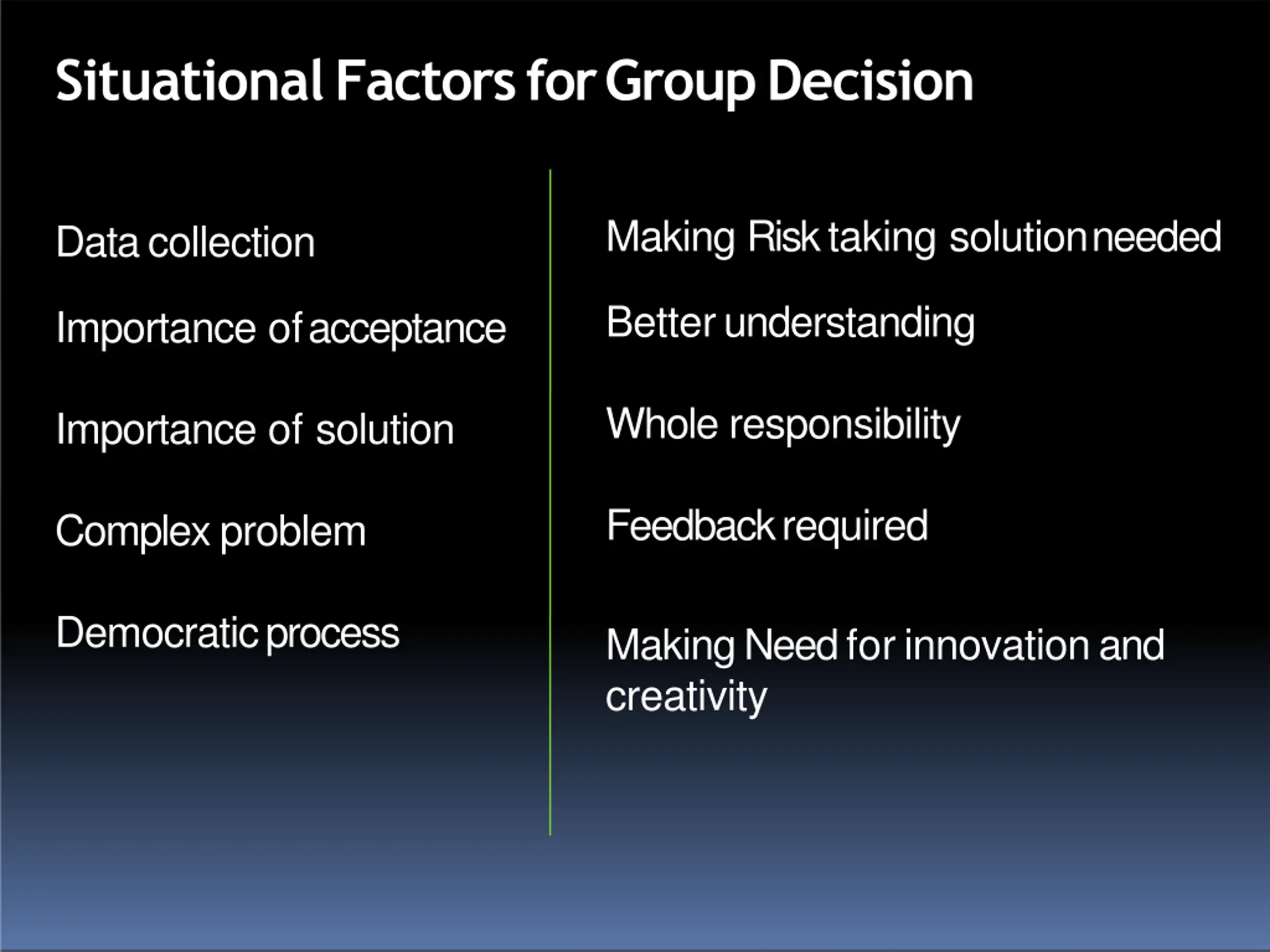 SituationalFactorsforGroupDecision Making Risk taking solutionneeded Datacollection Betterunderstanding Importance ofacceptance Whole responsibility Importance of solution Feedbackrequired Complex problem Democraticprocess MakingNeedforinnovationand creativity