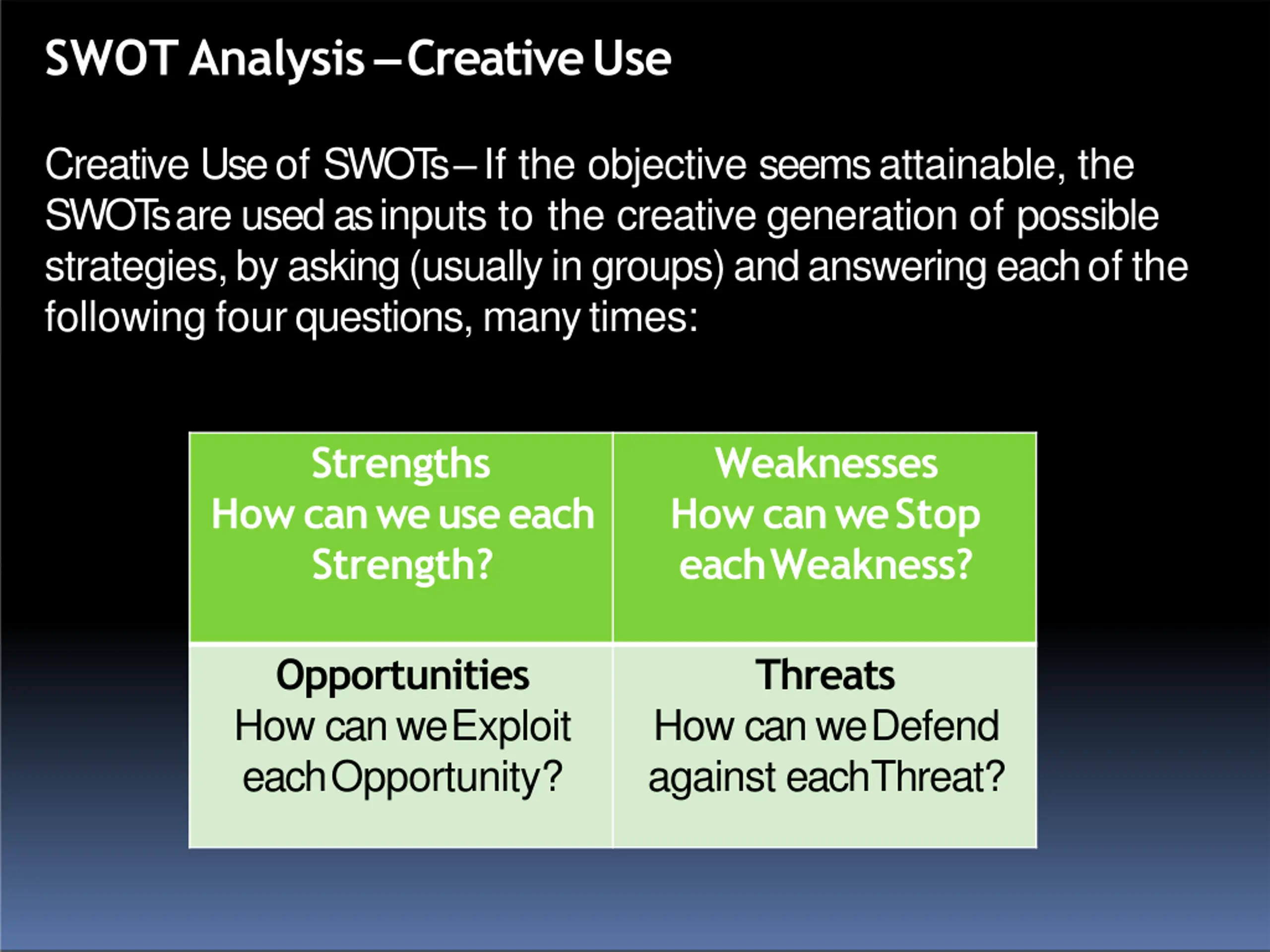 SWOTAnalysisCreativeUse Creative Use of SWOT s If the objective seems attainable, the SWOT s are used as inputs to the creative generation of possible strategies,byasking(usuallyingroups)andansweringeachof the followingfourquestions,manytimes: Strengths Weaknesses HowcanweStop eachWeakness? Howcanweuseeach Strength? Opportunities How can weExploit eachOpportunity? Threats How can weDefend against eachThreat?