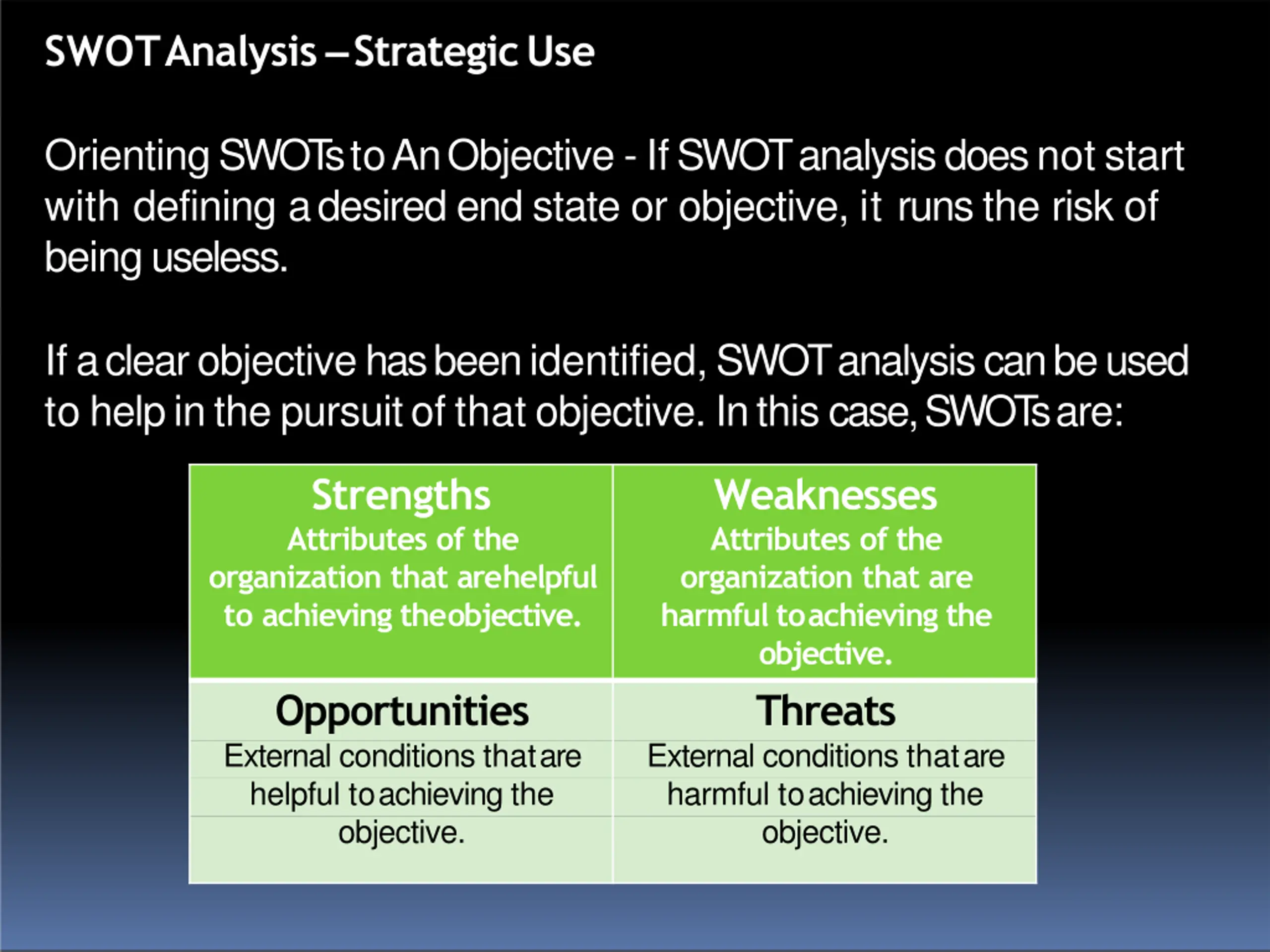 SWOTAnalysisStrategicUse OrientingSWOT stoAnObjective-IfSWOTanalysisdoesnot start with defining a desired end state or objective, it runs the risk of beinguseless. Ifaclearobjectivehasbeenidentified,SWOTanalysiscanbeused to helpinthepursuitof that objective. Inthiscase,SWOT sare: Strengths Attributes of the organization that arehelpful to achieving theobjective. Weaknesses Attributes of the organization that are harmful toachieving the objective. Threats External conditions thatare harmful toachieving the objective. Opportunities External conditions thatare helpful toachieving the objective.
