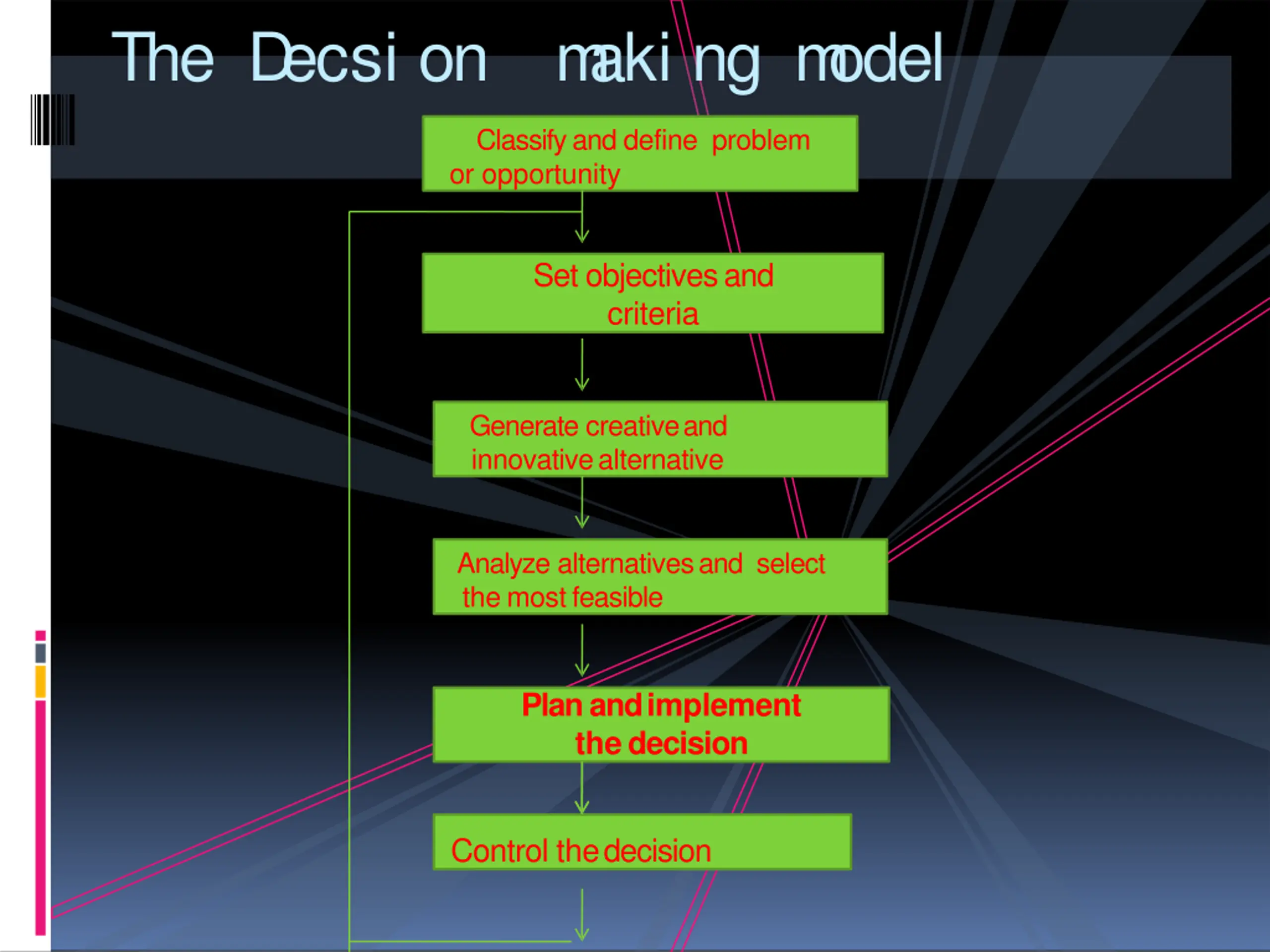 The D ecsi on m aki ng m odel Classify and define problem or opportunity Set objectivesand criteria Generate creativeand innovativealternative Analyze alternativesand select the mostfeasible Plan andimplement thedecision Control thedecision