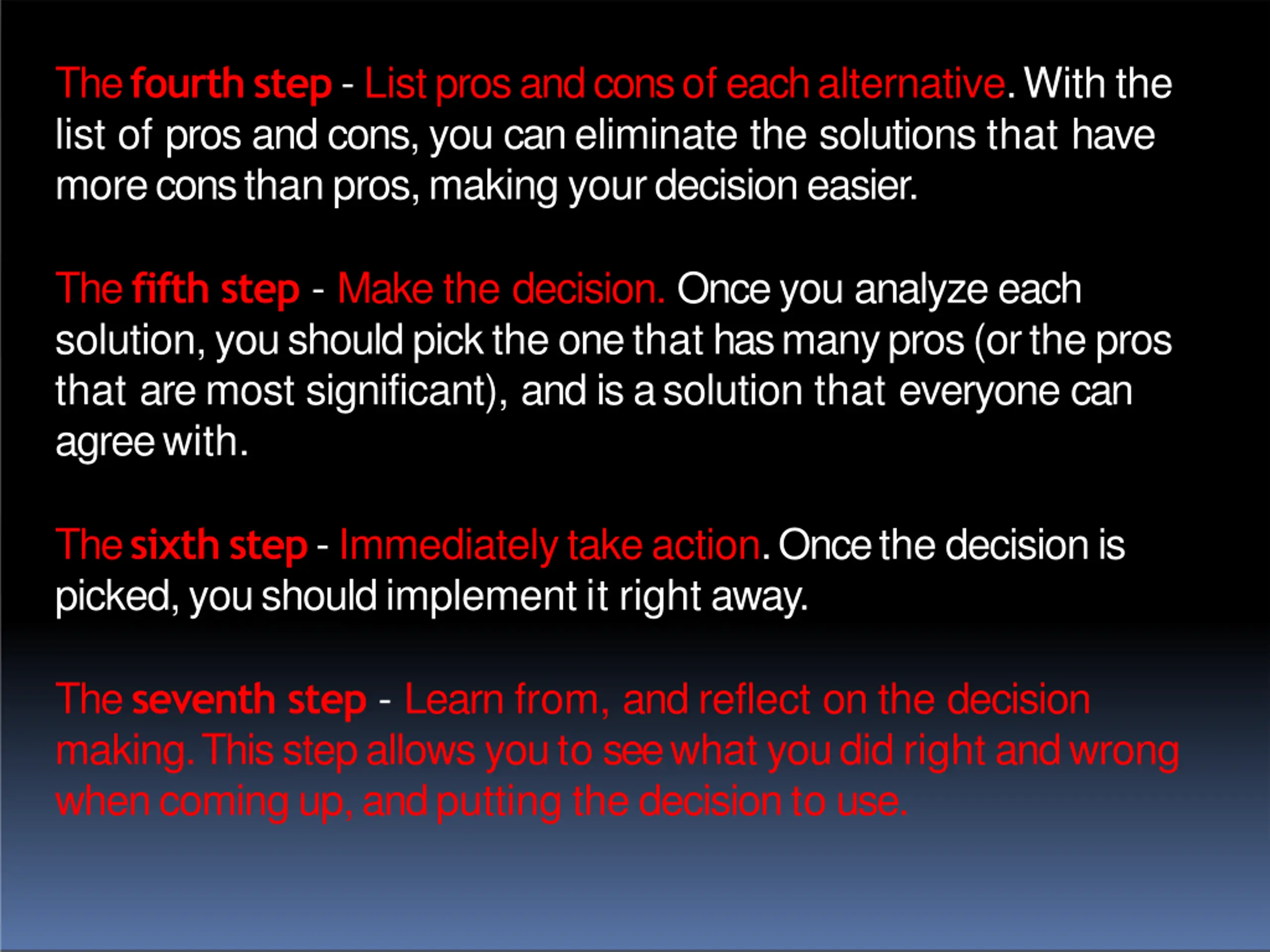 Thefourthstep- Listprosandconsofeachalternative.Withthe list of pros and cons, you can eliminate the solutions that have moreconsthanpros,makingyourdecisioneasier. The fifth step - Make the decision. Once you analyze each solution,youshouldpicktheonethat hasmanypros(orthepros that are most significant), and is a solution that everyone can agreewith. Thesixthstep-Immediatelytakeaction.Oncethedecisionis picked,youshouldimplement it right away. The seventh step - Learn from, and reflect on the decision making.Thisstepallowsyouto seewhat youdid right andwrong whencomingup,andputting thedecisionto use.