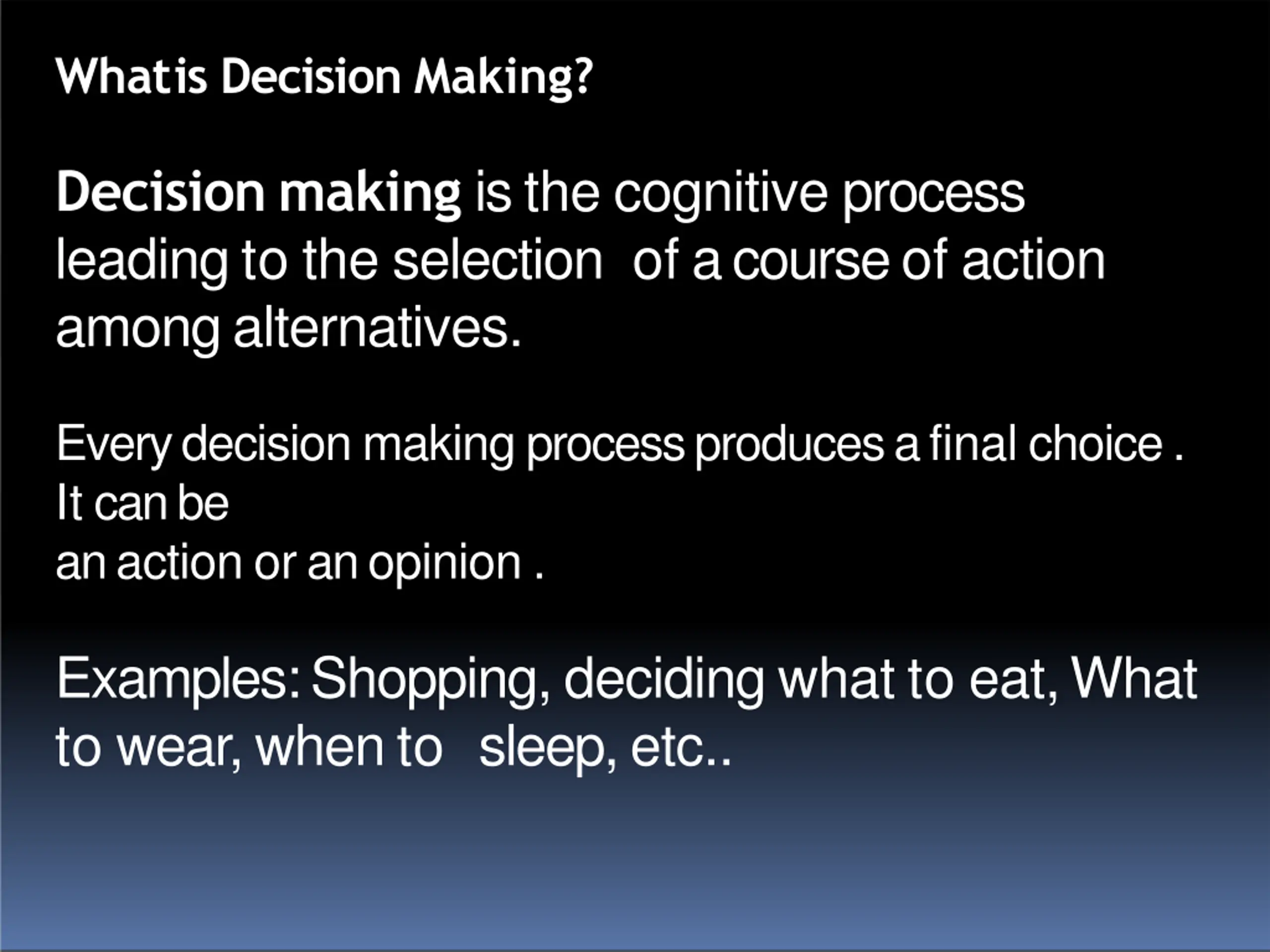 Whatis Decision Making? Decisionmaking isthe cognitive process leadingto the selection of acourseof action amongalternatives. Everydecisionmaking processproducesafinal choice. It canbe anaction oranopinion . Examples:Shopping, decidingwhat to eat,What to wear,whento sleep,etc..