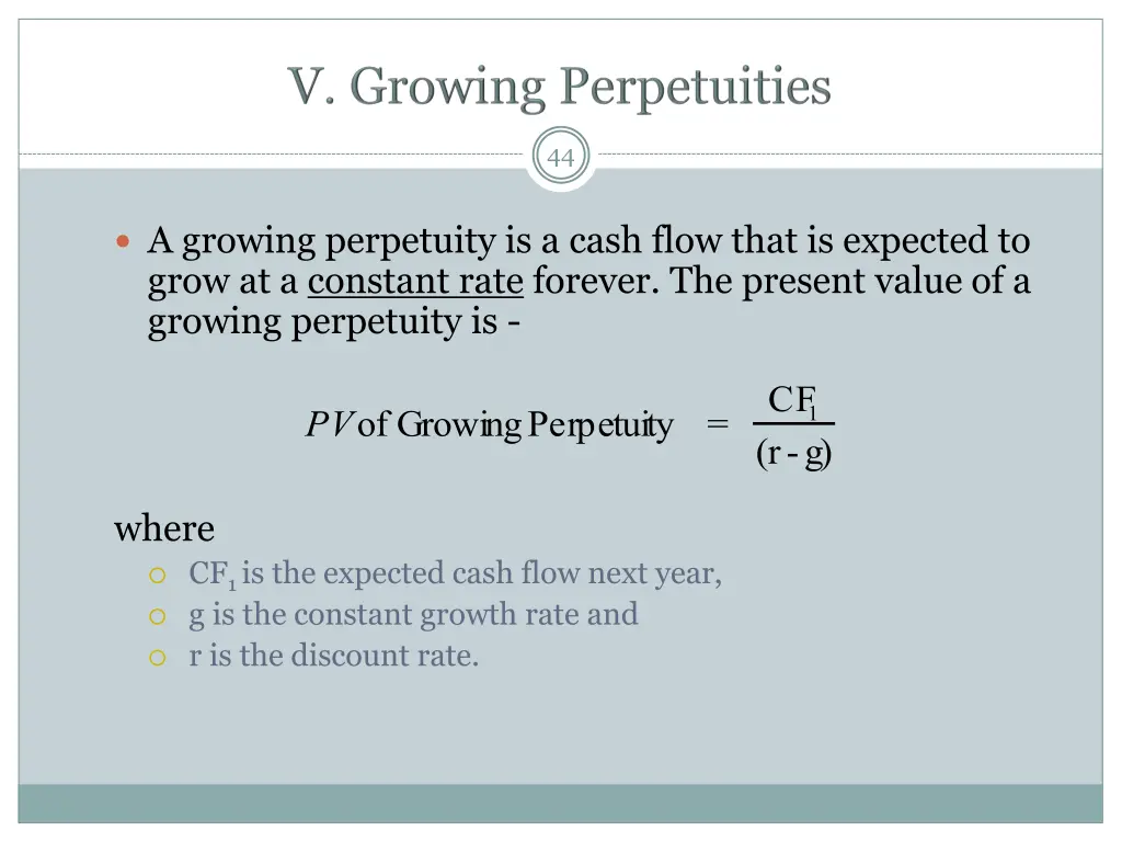 44 A growing perpetuity is a cash flow that is expected to grow at a constant rate forever. The present value of a growing perpetuity is - PV of Growing Perpetuity = CF1 (r-g) where CF1 is the expected cash flow next year, g is the constant growth rate and r is the discount rate.