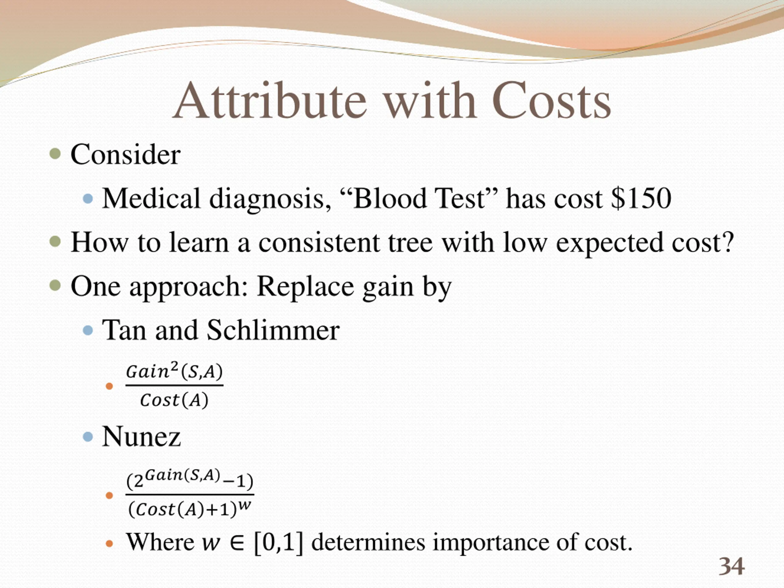 Attribute with Costs Consider Medical diagnosis, Blood Test has cost $150 How to learn a consistent tree with low expected cost? One approach: Replace gain by Tan and Schlimmer ????2?,? ???? ? Nunez (2???? ?,? 1) ???? ? +1? Where ? [0,1] determines importance of cost. 34