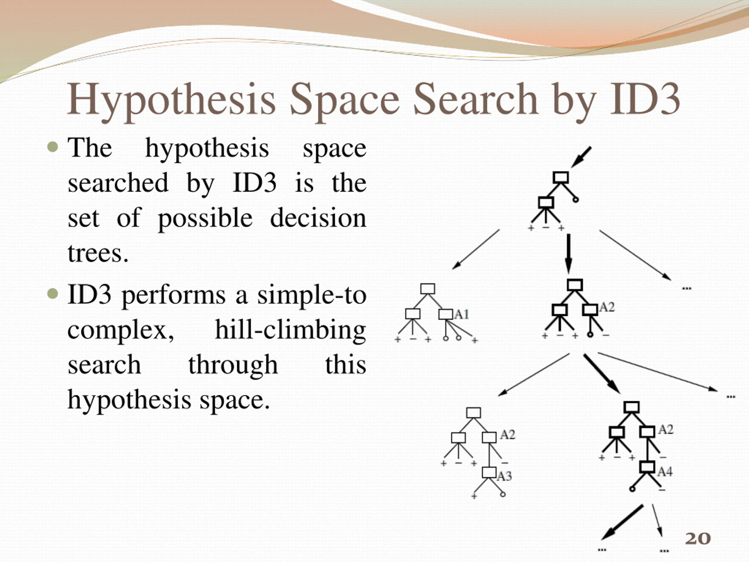 Hypothesis Space Search by ID3 The hypothesis space searched by ID3 is the set of possible decision trees. ID3 performs a simple-to complex, hill-climbing search through this hypothesis space. 20