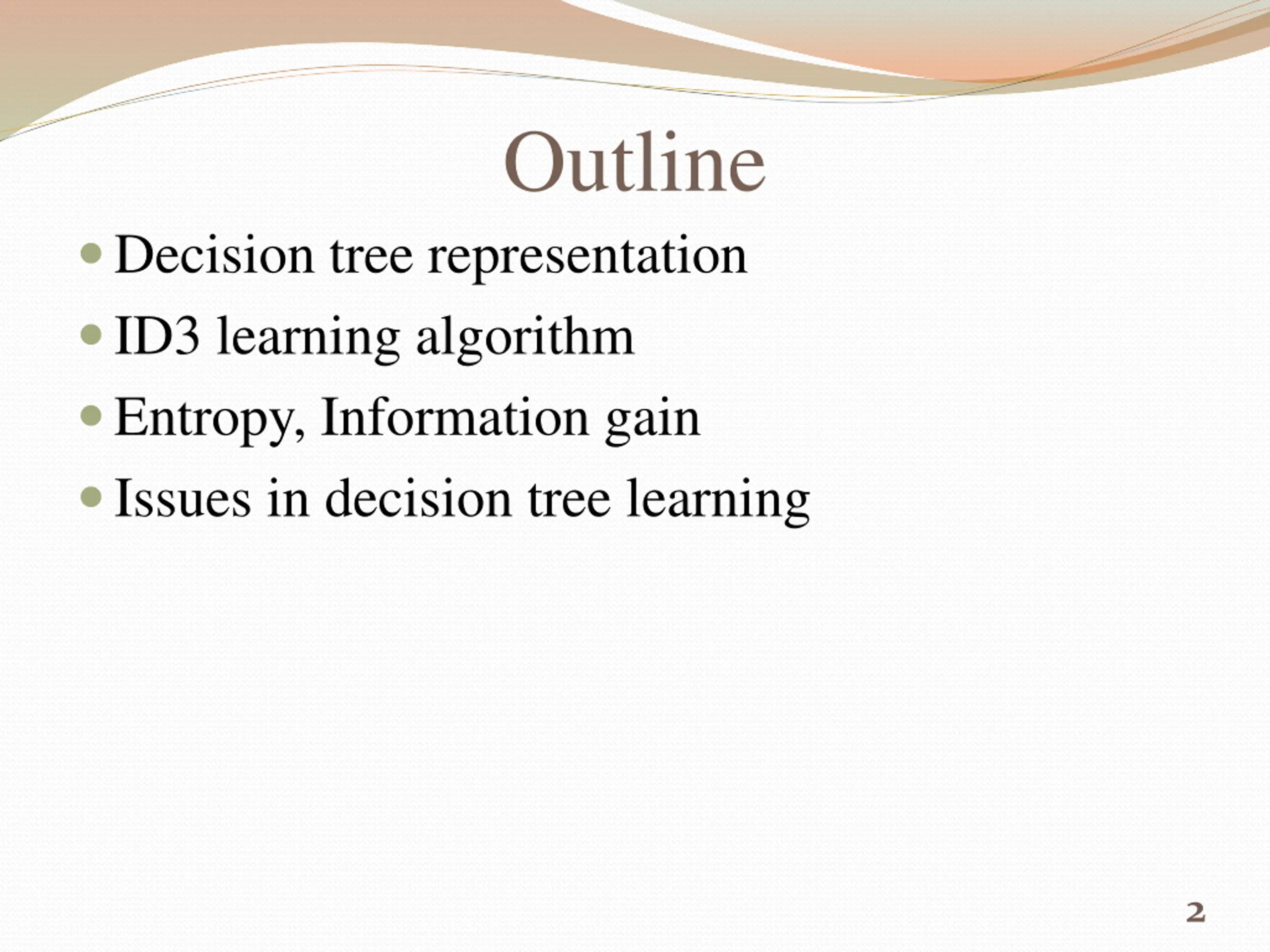 Outline Decision tree representation ID3 learning algorithm Entropy, Information gain Issues in decision tree learning 2