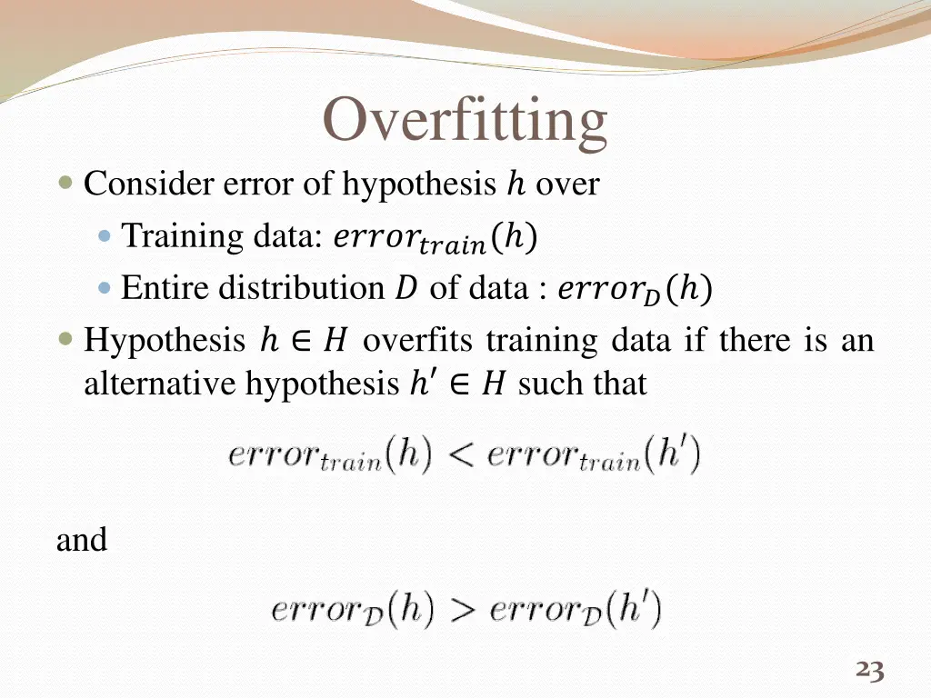 Overfitting Consider error of hypothesis over Training data: ??????????( ) Entire distribution ? of data : ??????( ) Hypothesis ? overfits training data if there is an alternative hypothesis ? such that and 23