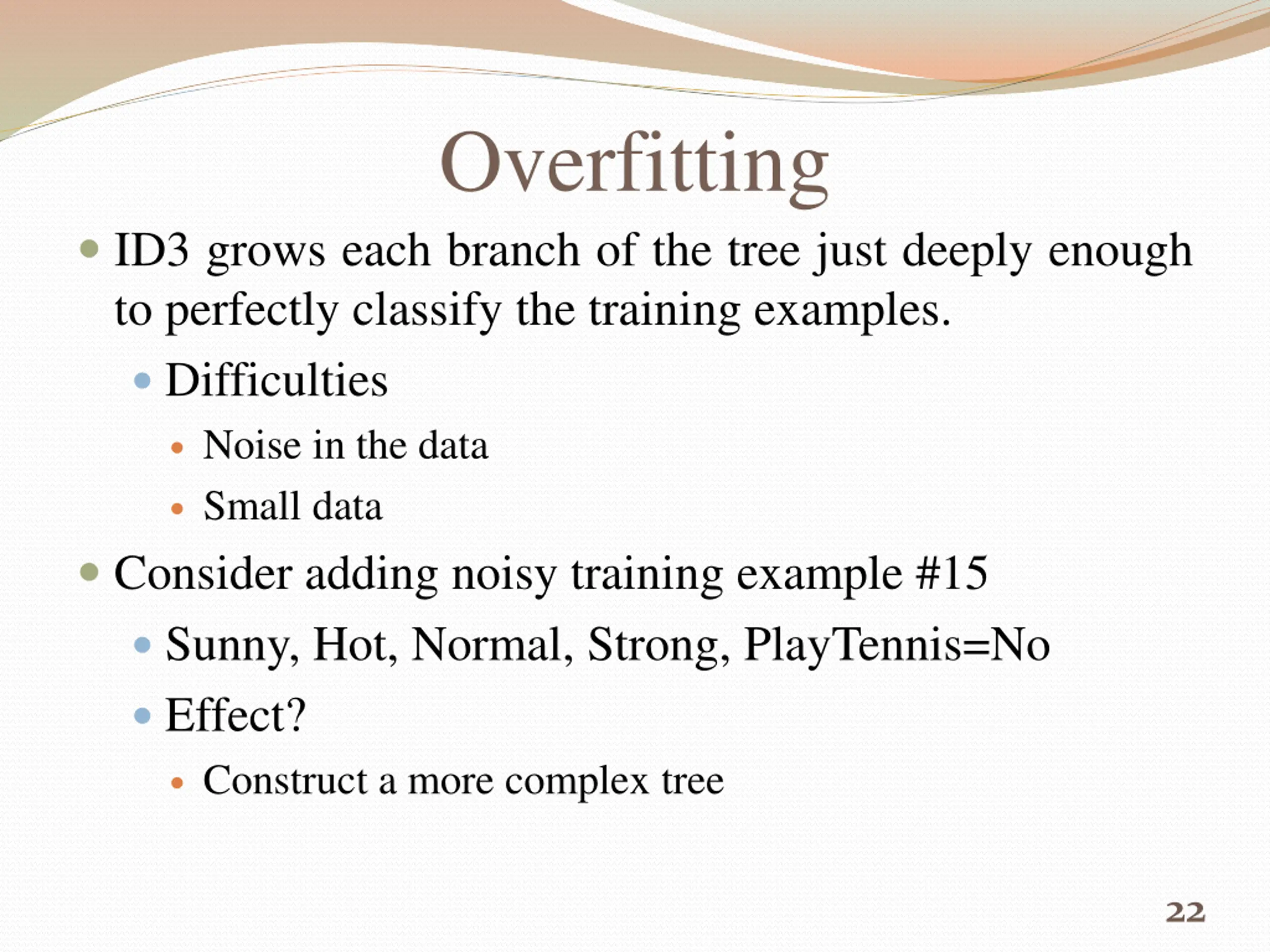 Overfitting ID3 grows each branch of the tree just deeply enough to perfectly classify the training examples. Difficulties Noise in the data Small data Consider adding noisy training example #15 Sunny, Hot, Normal, Strong, PlayTennis=No Effect? Construct a more complex tree 22