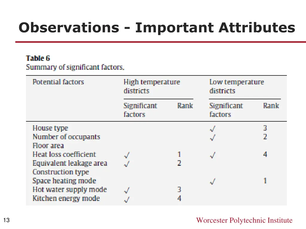 Results - Decision Rules Example Rule for Node 10: If TEMP is high and HLC < 3.89 and ELA < 4.41 and HWS is electric then EUI is LOW Taken from [1] and modified Worcester Polytechnic Institute 12