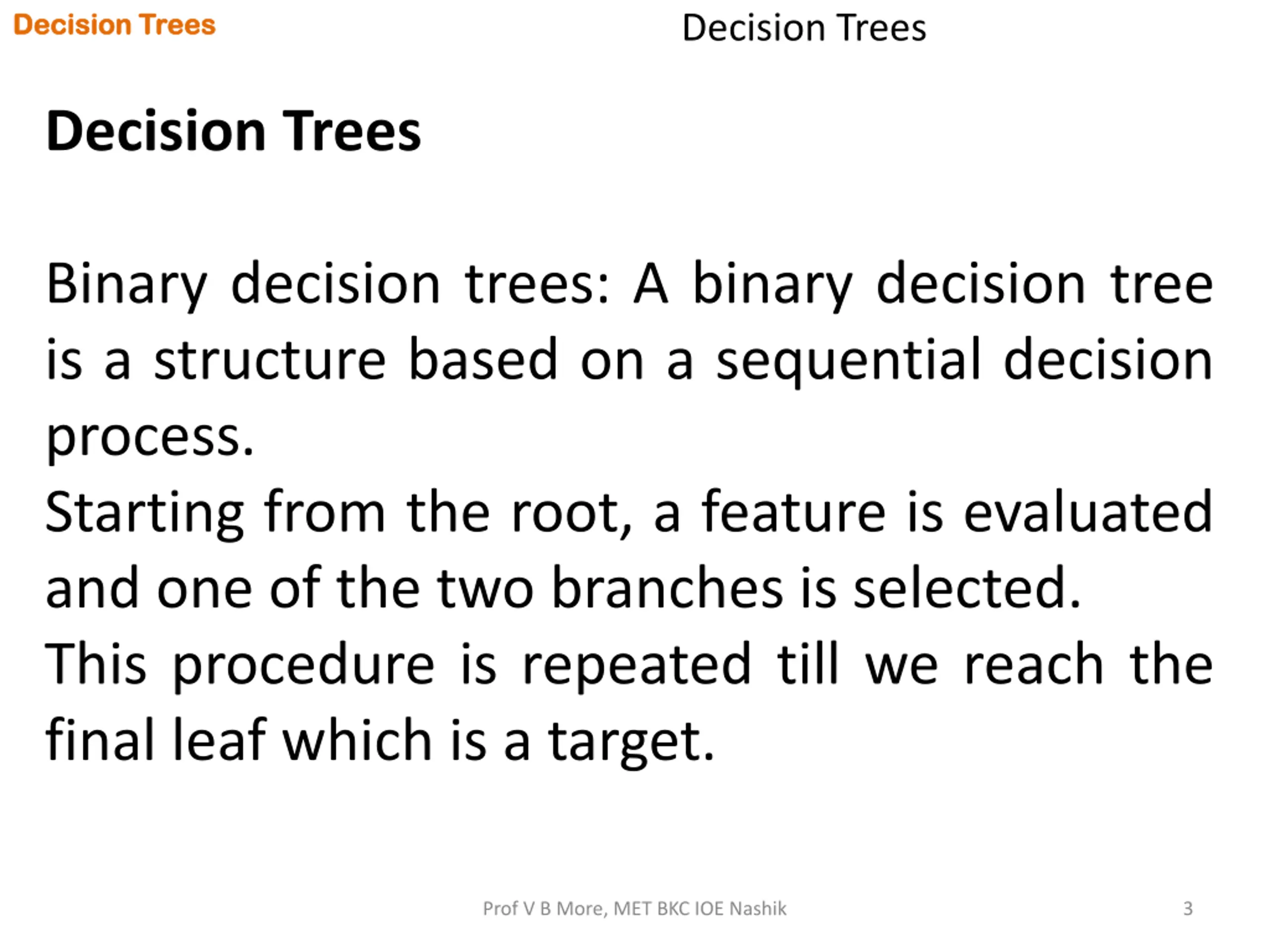 Decision Trees Decision Trees Decision Trees Decision Trees Binary decision trees: A binary decision tree is a structure based on a sequential decision process. Starting from the root, a feature is evaluated and one of the two branches is selected. This procedure is repeated till we reach the final leaf which is a target. Prof V B More, MET BKC IOE Nashik 3