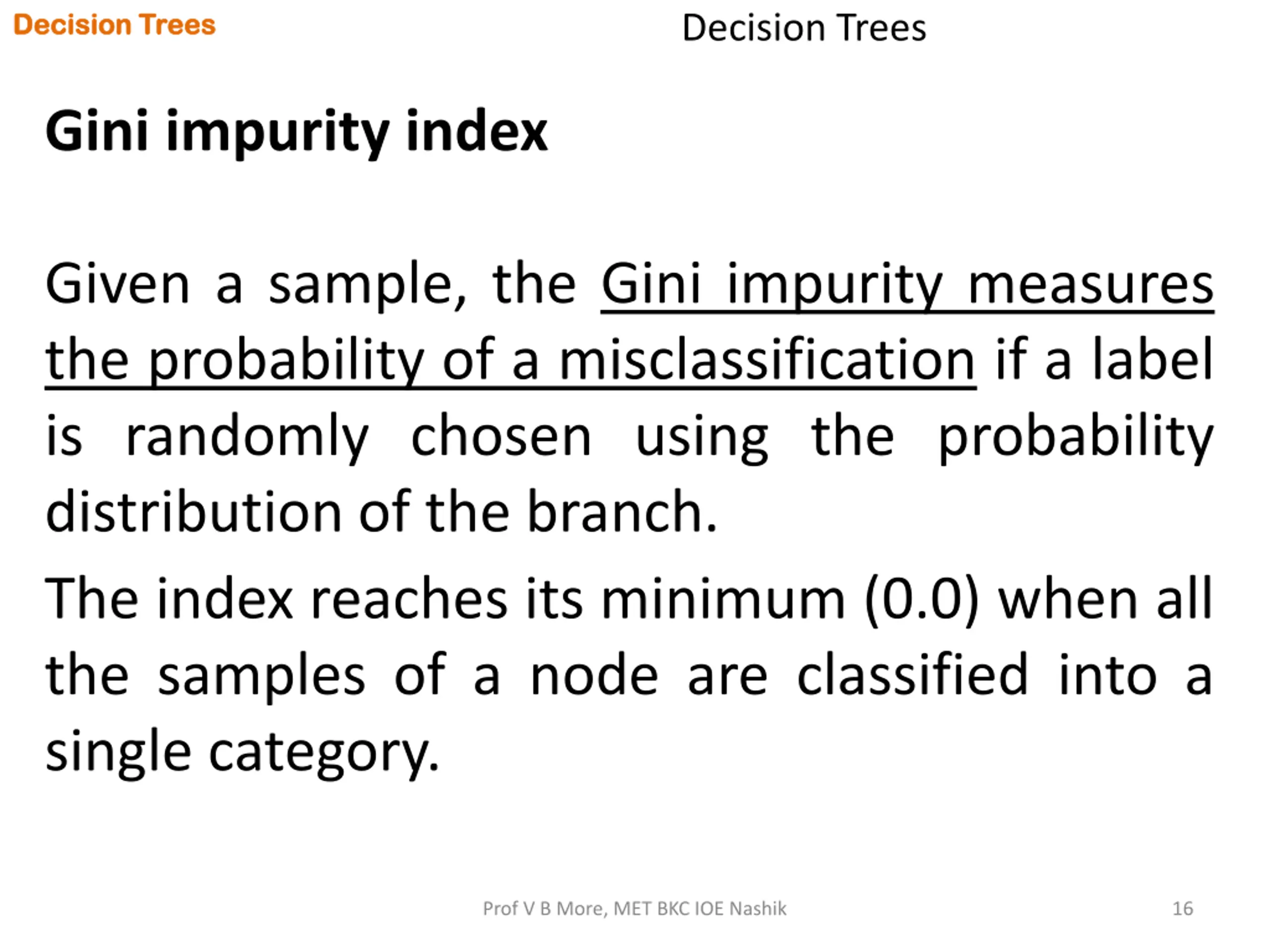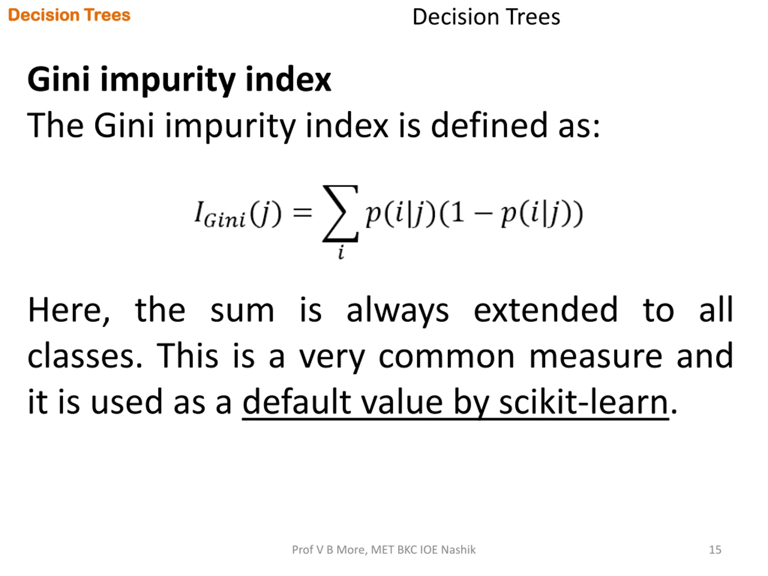 Decision Trees Decision Trees Decision Trees Gini impurity index The Gini impurity index is defined as: Here, the sum is always extended to all classes. This is a very common measure and it is used as a default value by scikit-learn. Prof V B More, MET BKC IOE Nashik 15