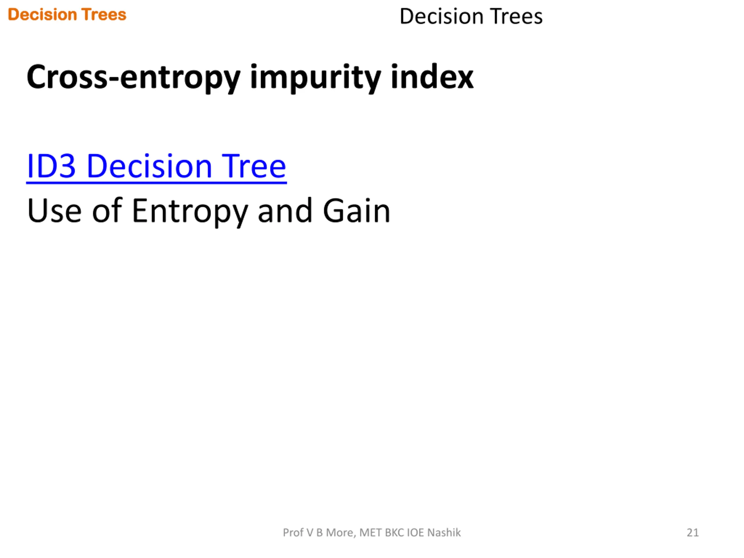 Decision Trees Decision Trees Decision Trees Cross-entropy impurity index ID3 Decision Tree Use of Entropy and Gain Prof V B More, MET BKC IOE Nashik 21