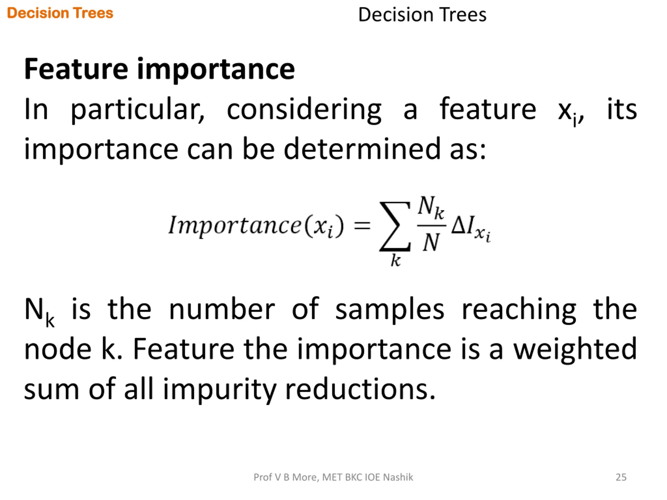 Decision Trees Decision Trees Decision Trees Feature importance In particular, considering a feature xi, its importance can be determined as: Nk is the number of samples reaching the node k. Feature the importance is a weighted sum of all impurity reductions. Prof V B More, MET BKC IOE Nashik 25