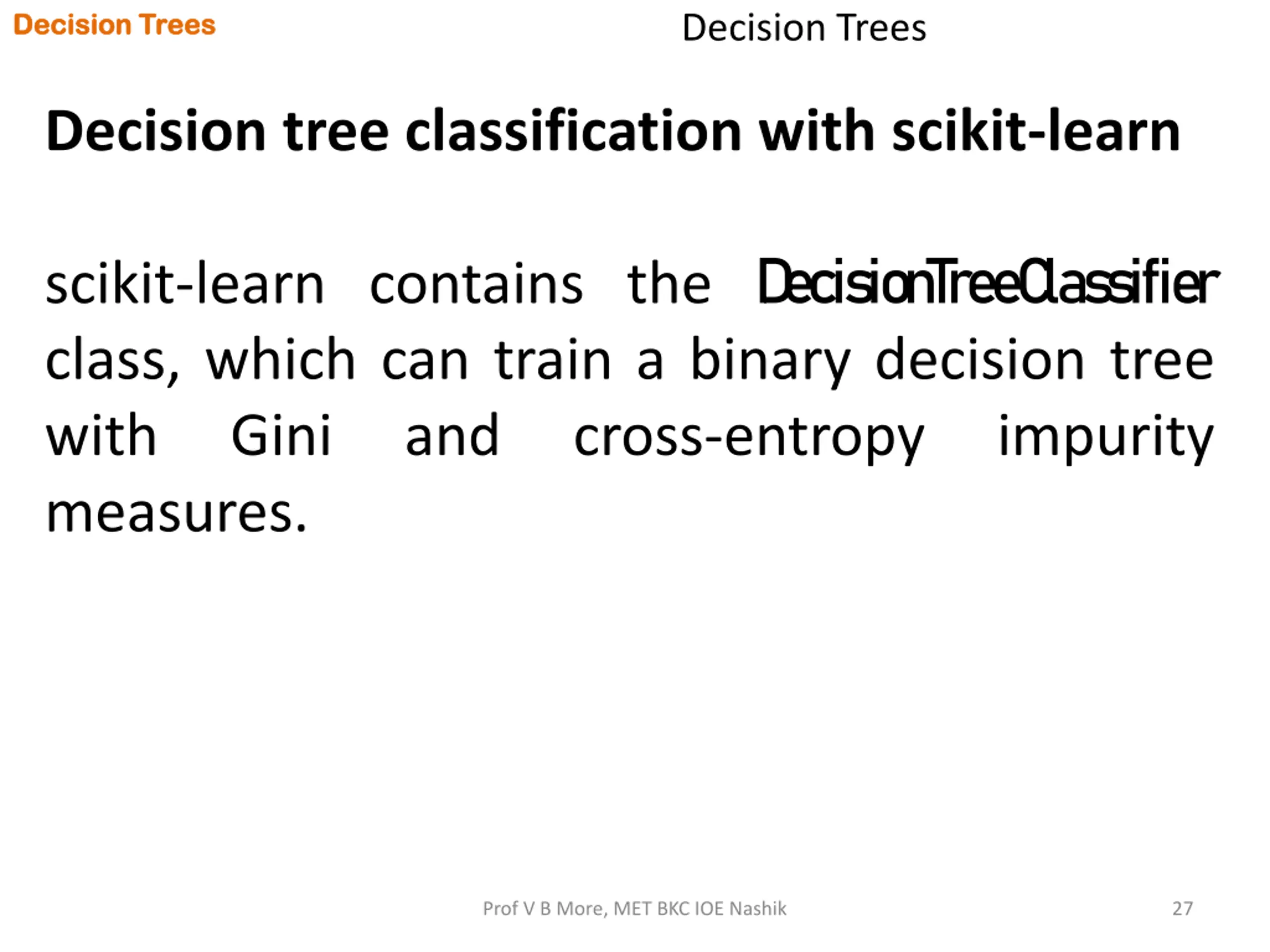 Decision Trees Decision Trees Decision Trees Decision tree classification with scikit-learn scikit-learn contains the D ecisionTreeC lassifier class, which can train a binary decision tree with Gini and cross-entropy measures. impurity Prof V B More, MET BKC IOE Nashik 27
