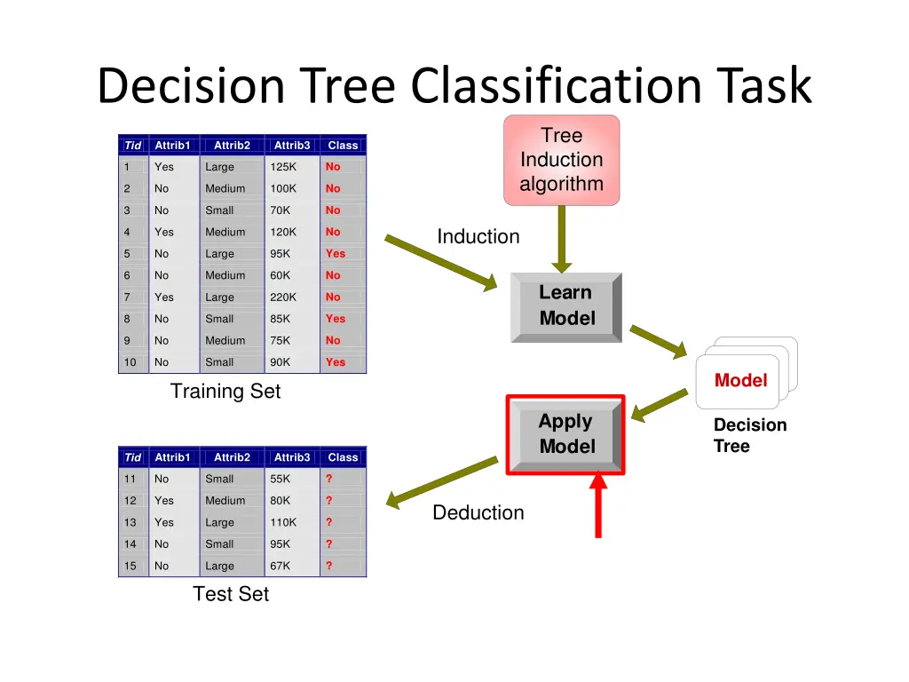Decision Tree Classification Task Tree Induction algorithm Attrib1 Attrib2 Attrib3 Class Tid No 1 Yes Large 125K No 2 No Medium 100K No 3 No Small 70K Induction No 4 Yes Medium 120K Yes 5 No Large 95K No 6 No Medium 60K Learn Model No 7 Yes Large 220K Yes 8 No Small 85K No 9 No Medium 75K Yes 10 No Small 90K Model 10 Training Set Apply Model Decision Tree Attrib1 Attrib2 Attrib3 Class Tid ? 11 No Small 55K ? 12 Yes Medium 80K Deduction ? 13 Yes Large 110K ? 14 No Small 95K ? 15 No Large Test Set 67K 10