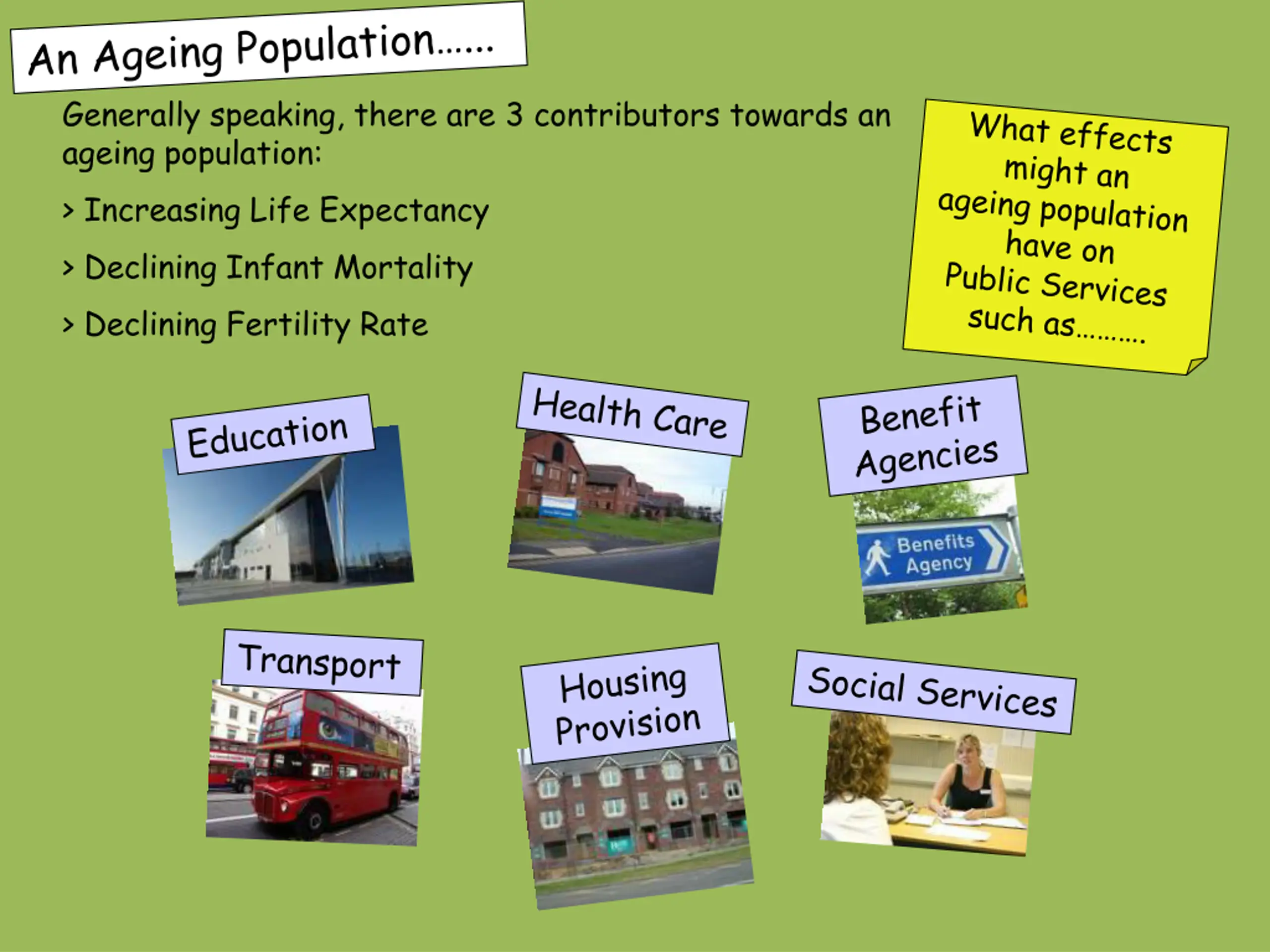 Generally speaking, there are 3 contributors towards an ageing population: > Increasing Life Expectancy > Declining Infant Mortality > Declining Fertility Rate http://t2.gstatic.com/images?q=tbn:k8_qTXo17a3vGM:http://s0.geograph.org.uk/photos/09/03/090389_465b7a2a.jpg http://t2.gstatic.com/images?q=tbn:FlweA6hhAO-h0M:http://www.cnplus.co.uk/pictures/586xAny/5/3/6/277536_Wakefield_College_2.jpg http://t0.gstatic.com/images?q=tbn:q9IsMJSoiLOa-M:http://www.politics.co.uk/photo/benefit-agency-sign-%247008246%24300.jpg http://t3.gstatic.com/images?q=tbn:ajP7aGnXBLz9MM:http://deckchairdiaries.files.wordpress.com/2009/01/public-transport.jpg http://t3.gstatic.com/images?q=tbn:OX-zA-VS5oqIpM:http://www.dbh.nhs.uk/Library/MediaServicesImages/Patient%2520with%2520consultant.jpg http://t2.gstatic.com/images?q=tbn:5ynGPkoaZi0MIM:http://www.shieldbrickwork.co.uk/NEW%2520PICTURES/Oct%252012%25202005%2520Bett%2520Homes/4%2520bedroomed%2520terraced%2520house,%2520westerghope.jpg