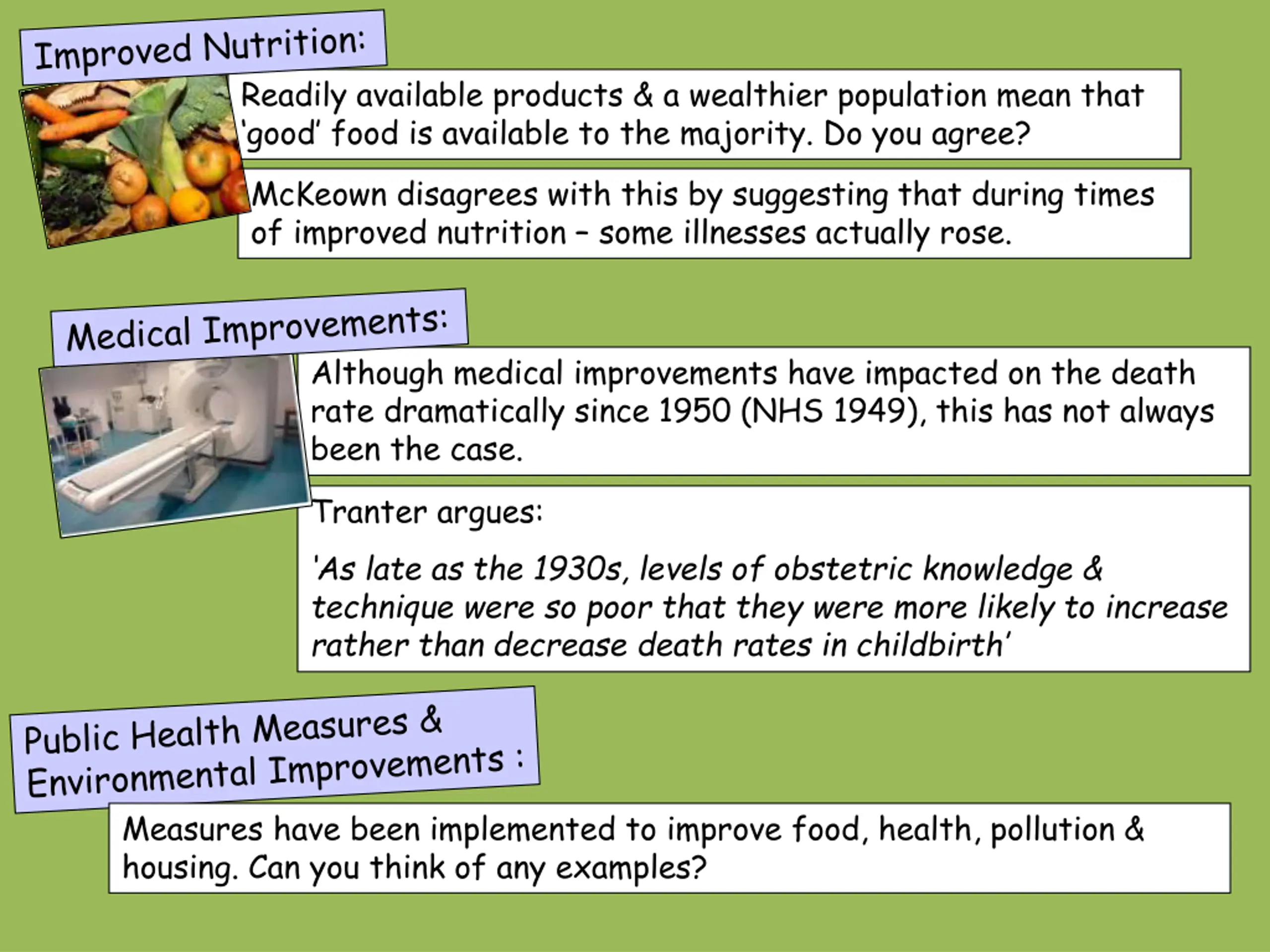 http://t3.gstatic.com/images?q=tbn:FoKTJ8fz97e04M:http://www.deliadriano.biz/Portals/0/veg%2520box%25202.jpghttp://t3.gstatic.com/images?q=tbn:FoKTJ8fz97e04M:http://www.deliadriano.biz/Portals/0/veg%2520box%25202.jpg Readily available products & a wealthier population mean that good food is available to the majority. Do you agree? McKeown disagrees with this by suggesting that during times of improved nutrition some illnesses actually rose. http://t2.gstatic.com/images?q=tbn:fY-O8OH8T9VcVM:http://29andfighting.files.wordpress.com/2009/07/ct-scan.jpg Although medical improvements have impacted on the death rate dramatically since 1950 (NHS 1949), this has not always been the case. Tranter argues: As late as the 1930s, levels of obstetric knowledge & technique were so poor that they were more likely to increase rather than decrease death rates in childbirth Measures have been implemented to improve food, health, pollution & housing. Can you think of any examples?