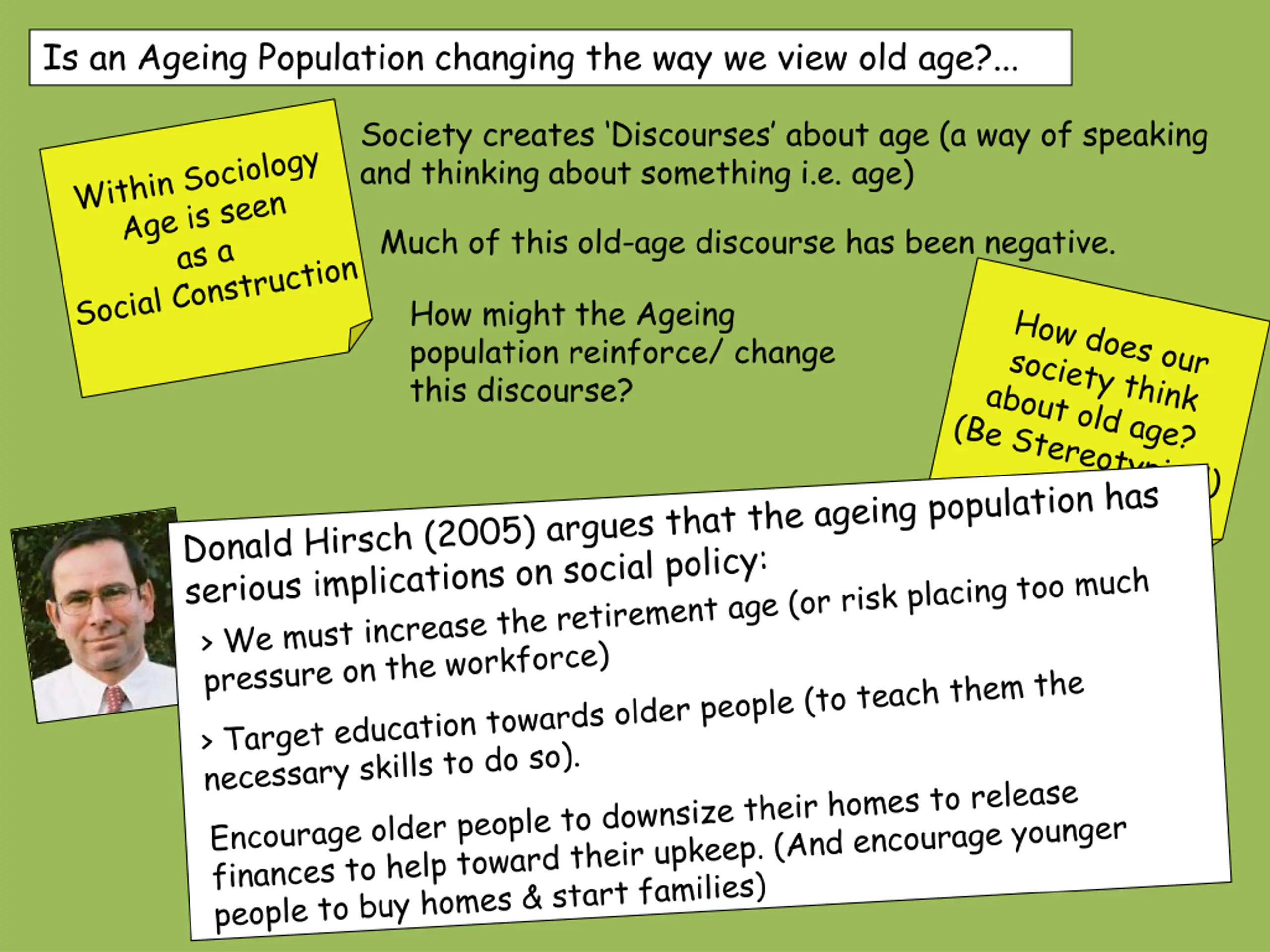 Is an Ageing Population changing the way we view old age?... Society creates Discourses about age (a way of speaking and thinking about something i.e. age) Much of this old-age discourse has been negative. How might the Ageing population reinforce/ change this discourse?