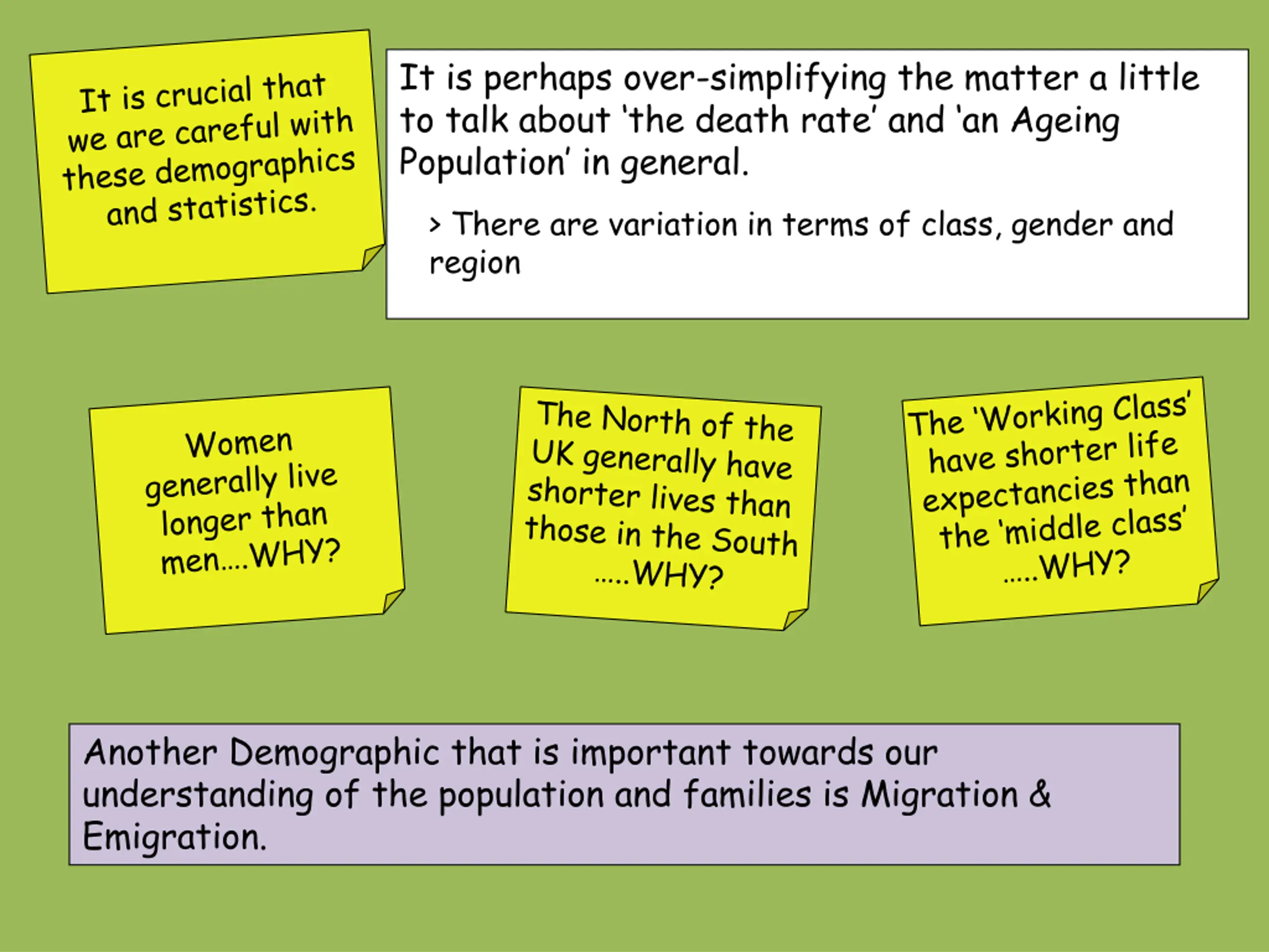 It is perhaps over-simplifying the matter a little to talk about the death rate and an Ageing Population in general. > There are variation in terms of class, gender and region Another Demographic that is important towards our understanding of the population and families is Migration & Emigration.