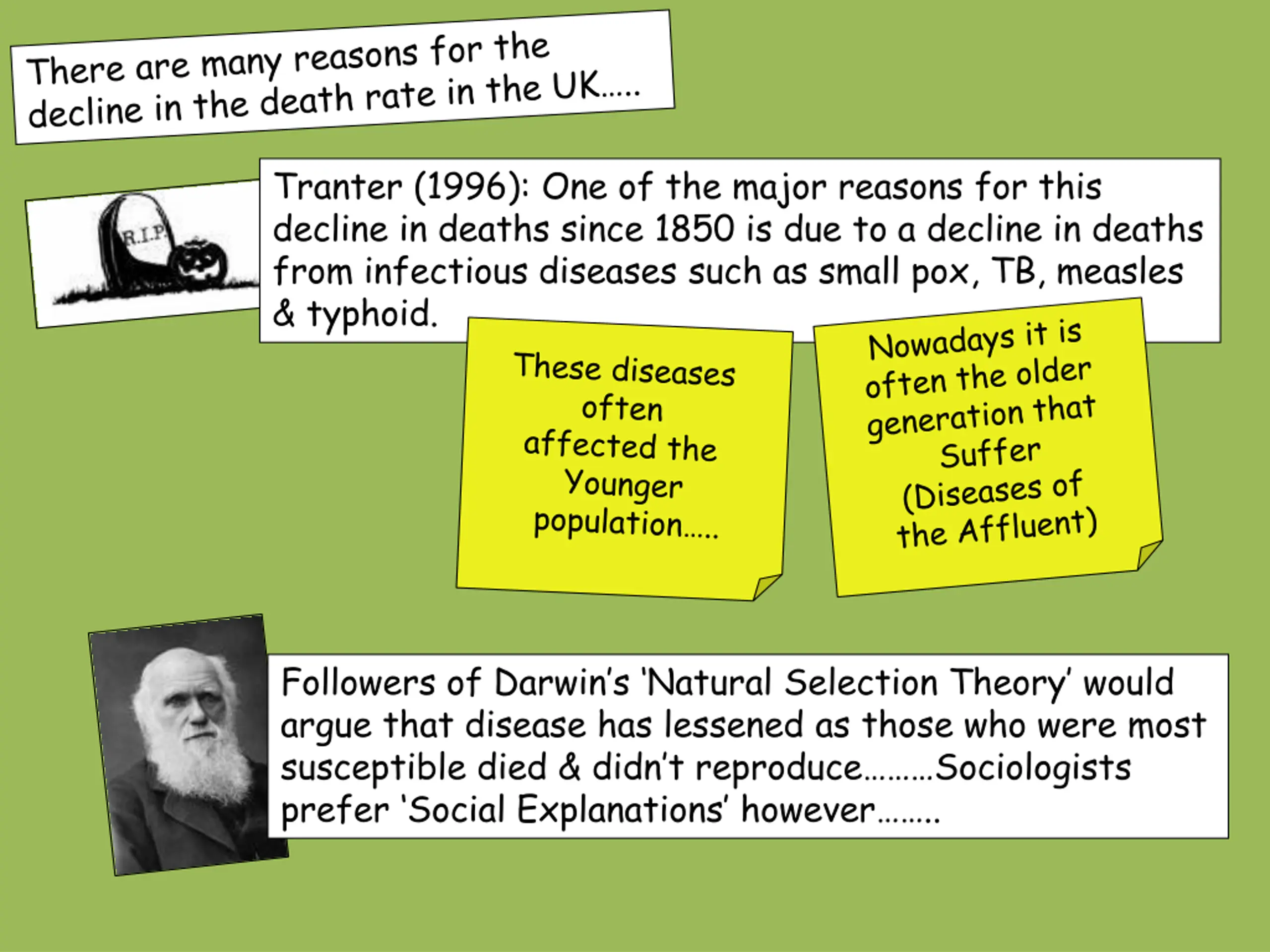Tranter (1996): One of the major reasons for this decline in deaths since 1850 is due to a decline in deaths from infectious diseases such as small pox, TB, measles & typhoid. http://t0.gstatic.com/images?q=tbn:Hs4IZF7whKfN_M:http://www.designbliss.com/wp-content/uploads/2007/10/gravestone_pumpkin.gif http://t0.gstatic.com/images?q=tbn:_Mcw_aJaIDRPVM:http://jeftavarwijk.files.wordpress.com/2009/09/051111_darwin_portrait_02.jpg Followers of Darwin s Natural Selection Theory would argue that disease has lessened as those who were most susceptible died & didn t reproduce Sociologists prefer Social Explanations however ..