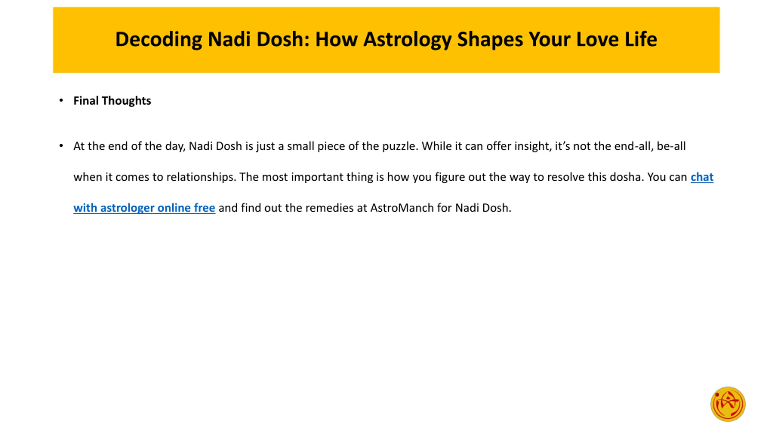 Decoding Nadi Dosh: How Astrology Shapes Your Love Life Final Thoughts At the end of the day, Nadi Dosh is just a small piece of the puzzle. While it can offer insight, it s not the end-all, be-all when it comes to relationships. The most important thing is how you figure out the way to resolve this dosha. You can chat with astrologer online free and find out the remedies at AstroManch for Nadi Dosh.