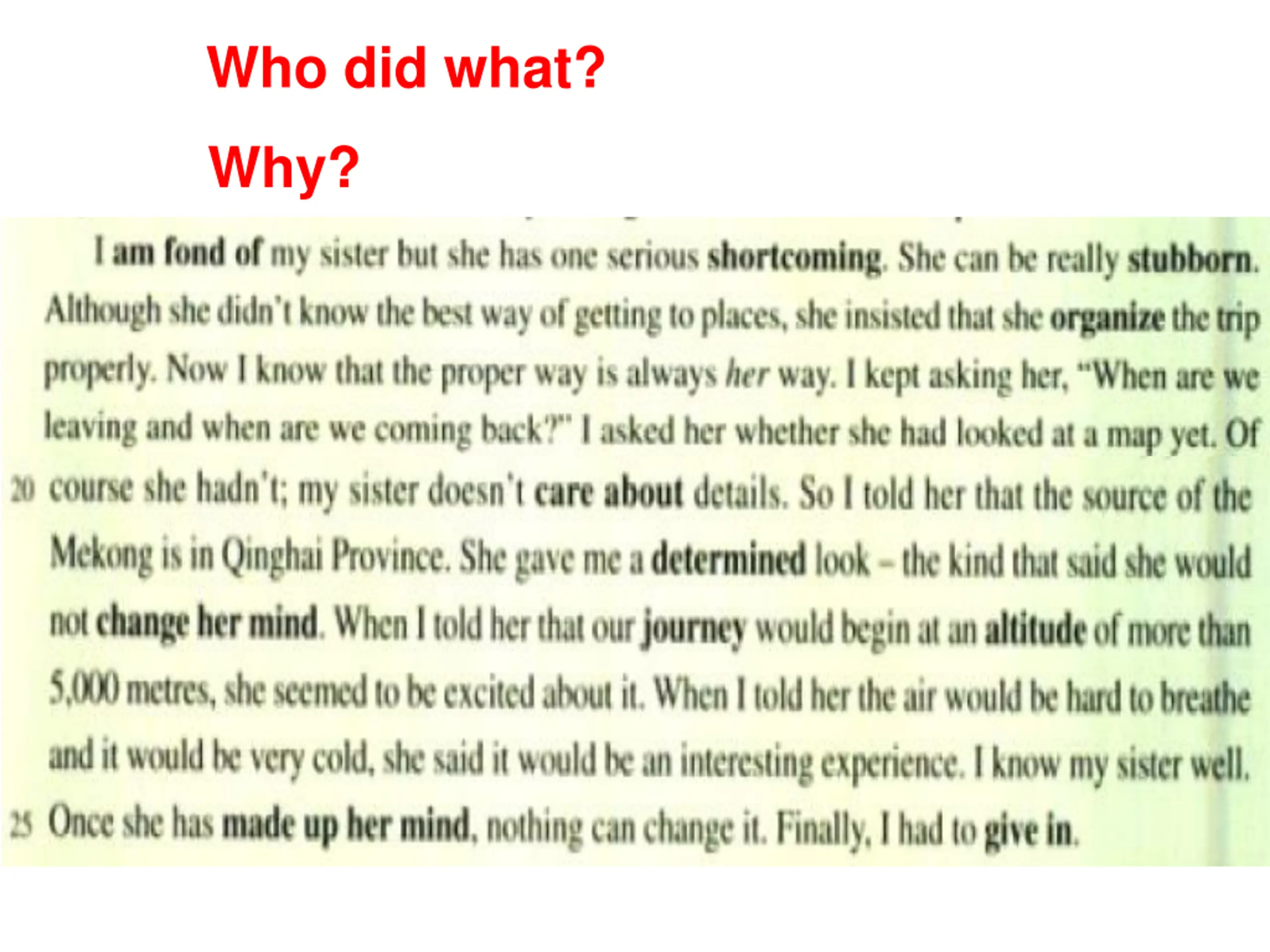 The main idea of the whole passage: Wang Kun and her sister Wang Wei decided to cycle along the entire Mekong River .Since Wang Wei was a stubborn girl, so she insisted organizing the trip .They went to the library and searched the information of the Mekong River for the preparation of their trip.