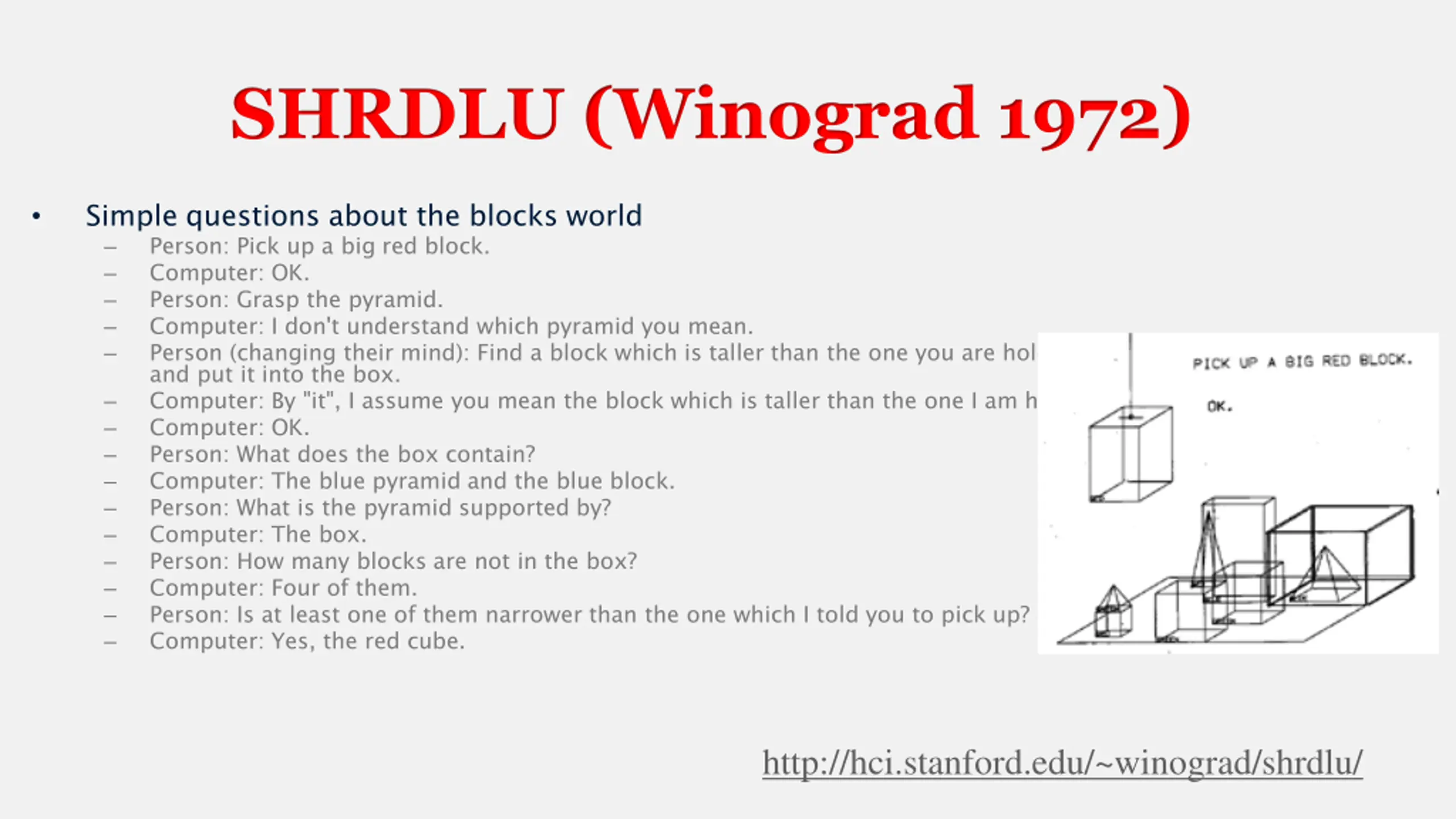 SHRDLU (Winograd 1972) Simple questions about the blocks world Person: Pick up a big red block. Computer: OK. Person: Grasp the pyramid. Computer: I don't understand which pyramid you mean. Person (changing their mind): Find a block which is taller than the one you are holding and put it into the box. Computer: By "it", I assume you mean the block which is taller than the one I am holding. Computer: OK. Person: What does the box contain? Computer: The blue pyramid and the blue block. Person: What is the pyramid supported by? Computer: The box. Person: How many blocks are not in the box? Computer: Four of them. Person: Is at least one of them narrower than the one which I told you to pick up? Computer: Yes, the red cube. http://hci.stanford.edu/~winograd/shrdlu/