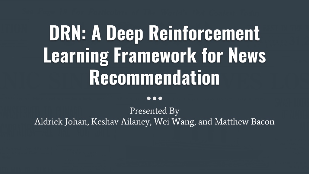 DRN: A Deep Reinforcement Learning Framework for News Recommendation Presented By Aldrick Johan, Keshav Ailaney, Wei Wang, and Matthew Bacon