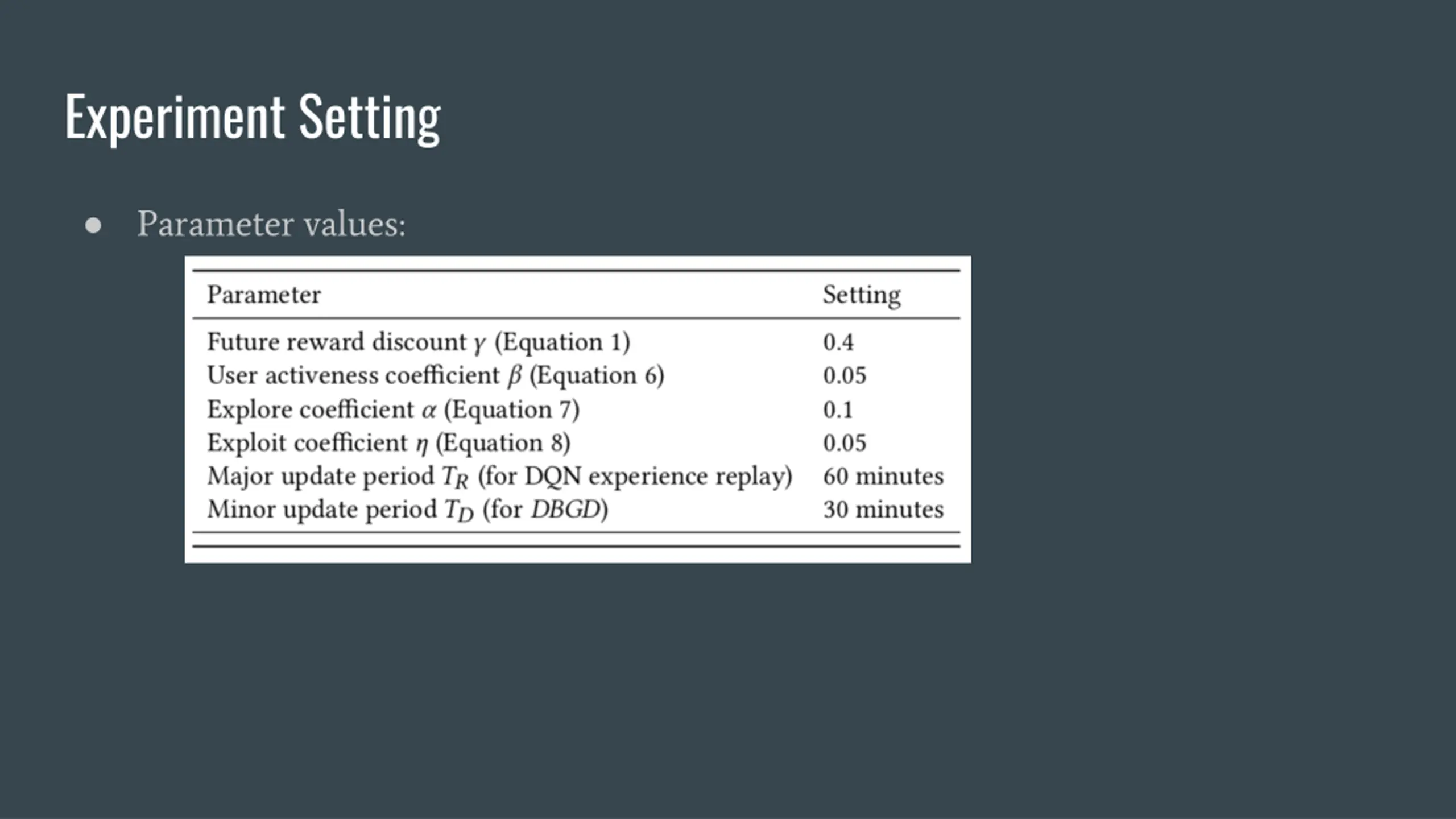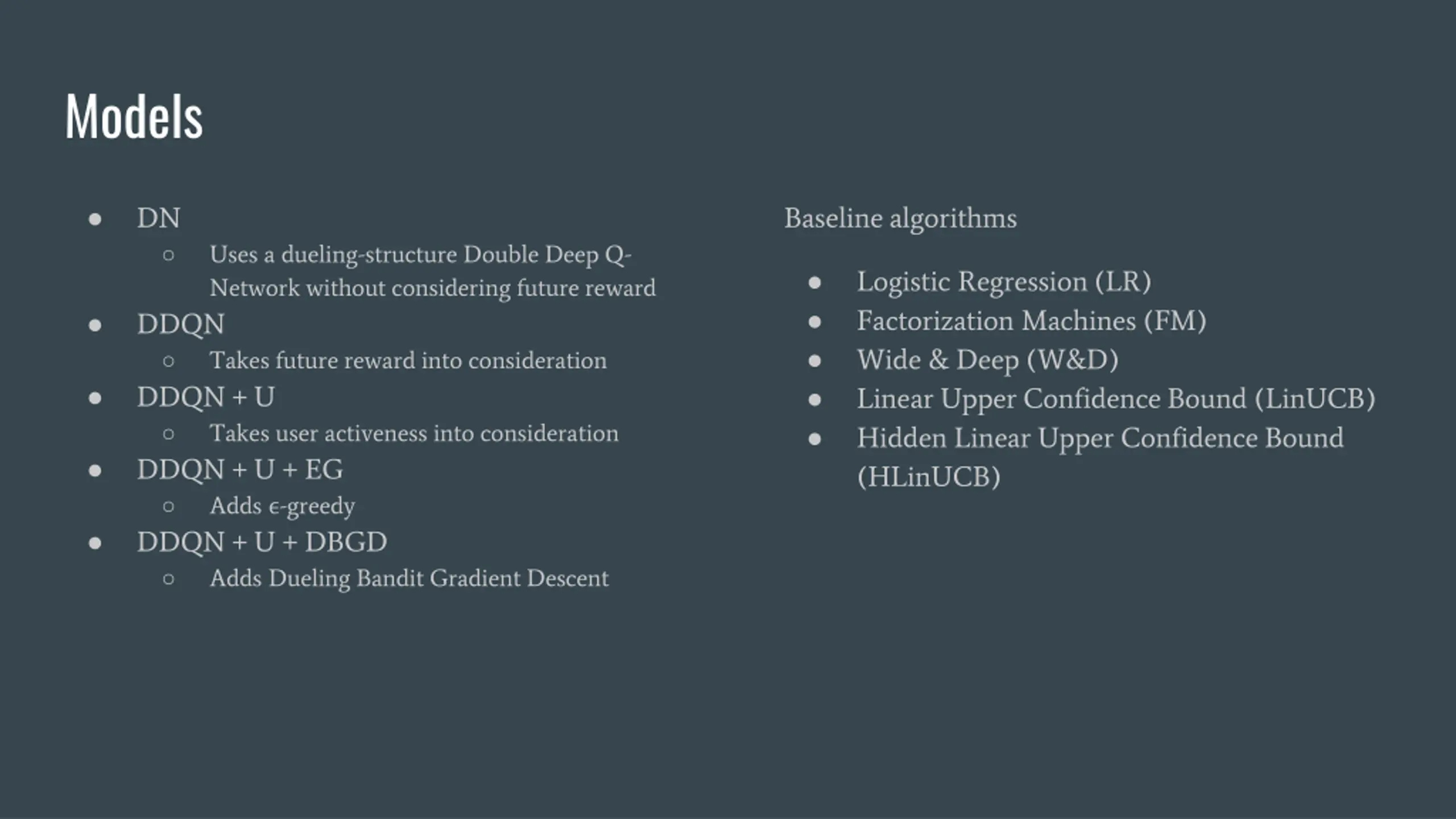 Models DN Baseline algorithms Uses a dueling-structure Double Deep Q- Network without considering future reward DDQN Takes future reward into consideration DDQN + U Takes user activeness into consideration DDQN + U + EG Adds -greedy DDQN + U + DBGD Adds Dueling Bandit Gradient Descent Logistic Regression (LR) Factorization Machines (FM) Wide & Deep (W&D) Linear Upper Confidence Bound (LinUCB) Hidden Linear Upper Confidence Bound (HLinUCB)