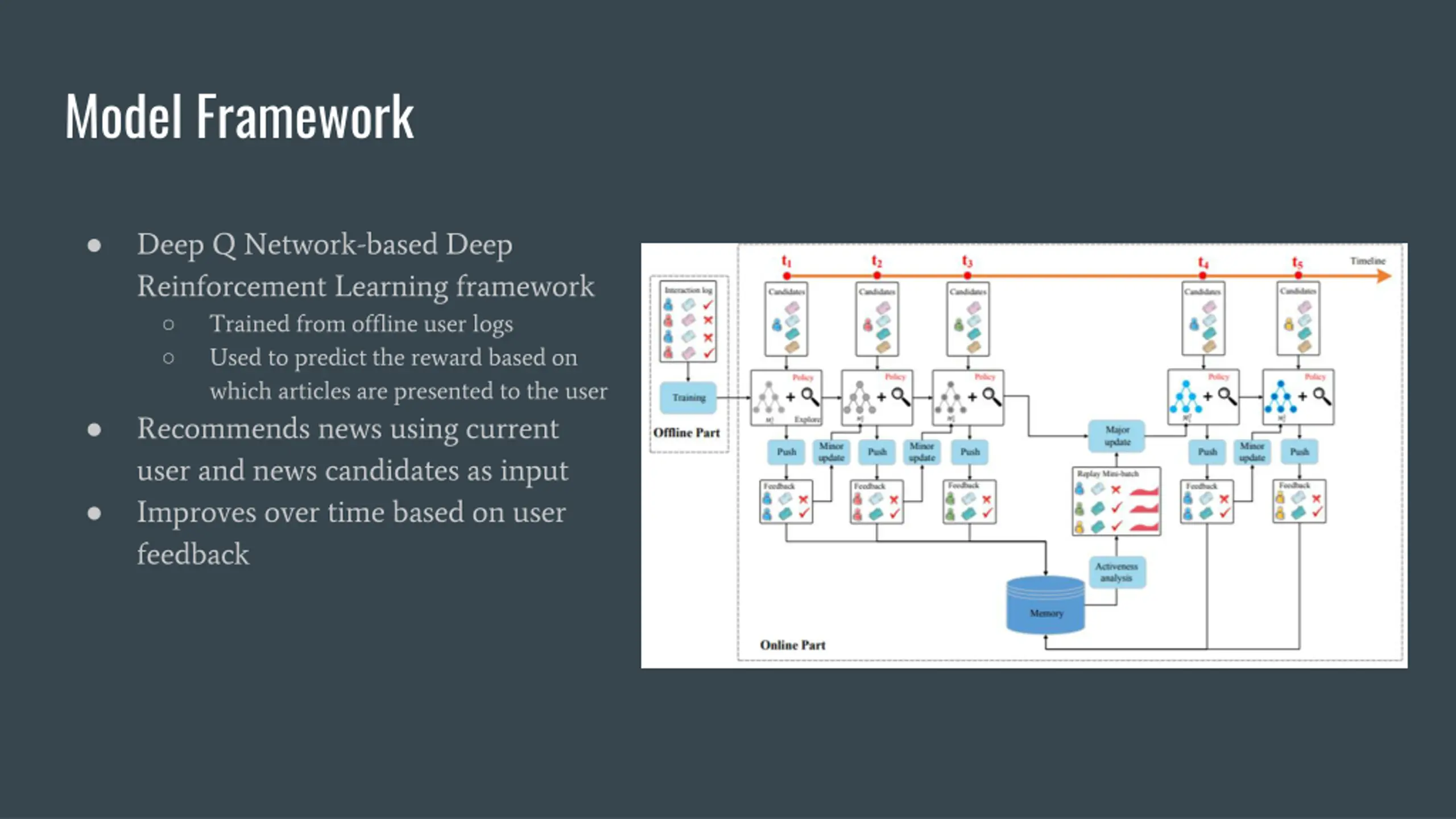 Model Framework Deep Q Network-based Deep Reinforcement Learning framework Trained from offline user logs Used to predict the reward based on which articles are presented to the user Recommends news using current user and news candidates as input Improves over time based on user feedback