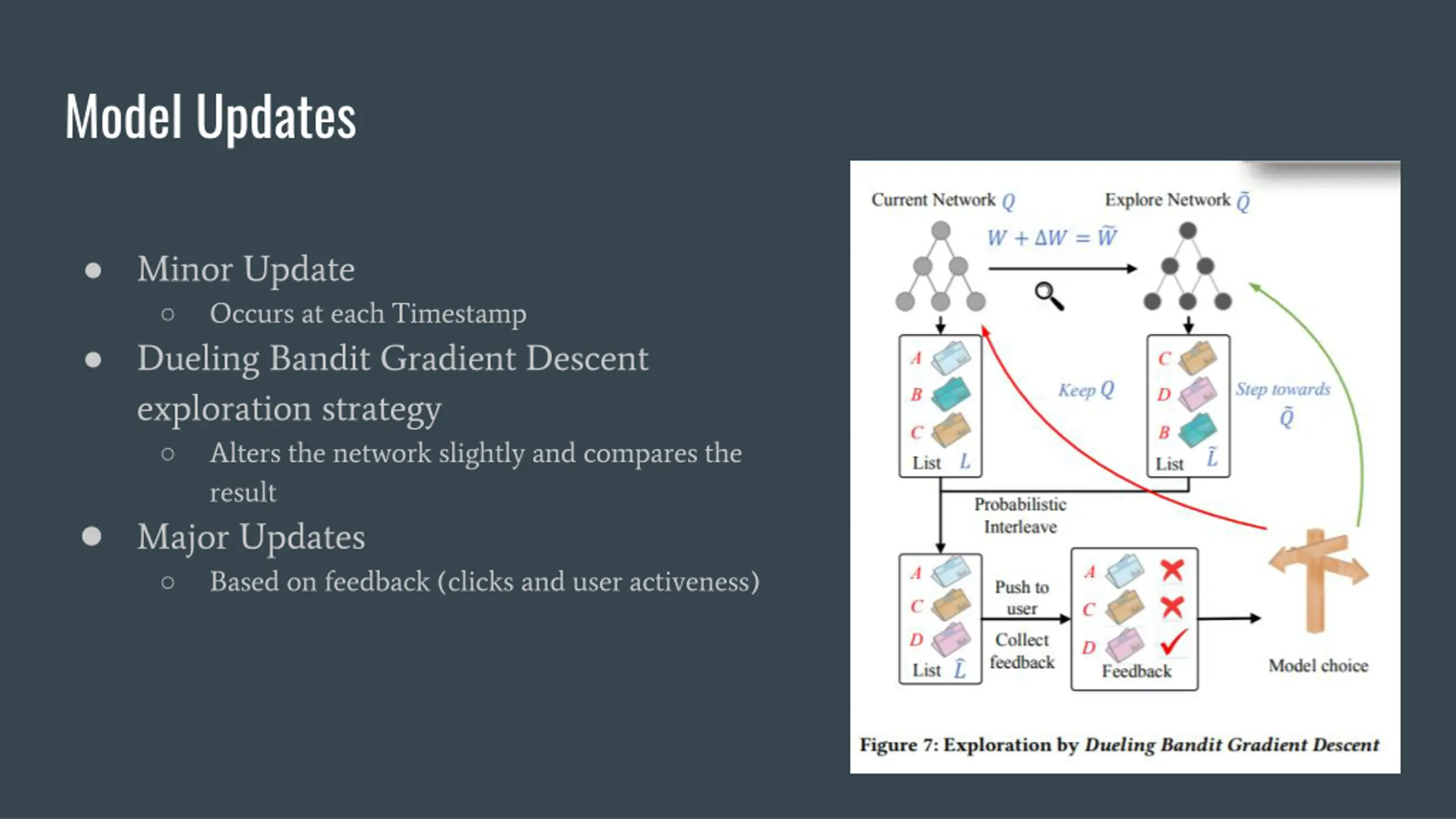 Model Updates Minor Update Occurs at each Timestamp Dueling Bandit Gradient Descent exploration strategy Alters the network slightly and compares the result Major Updates Based on feedback (clicks and user activeness)
