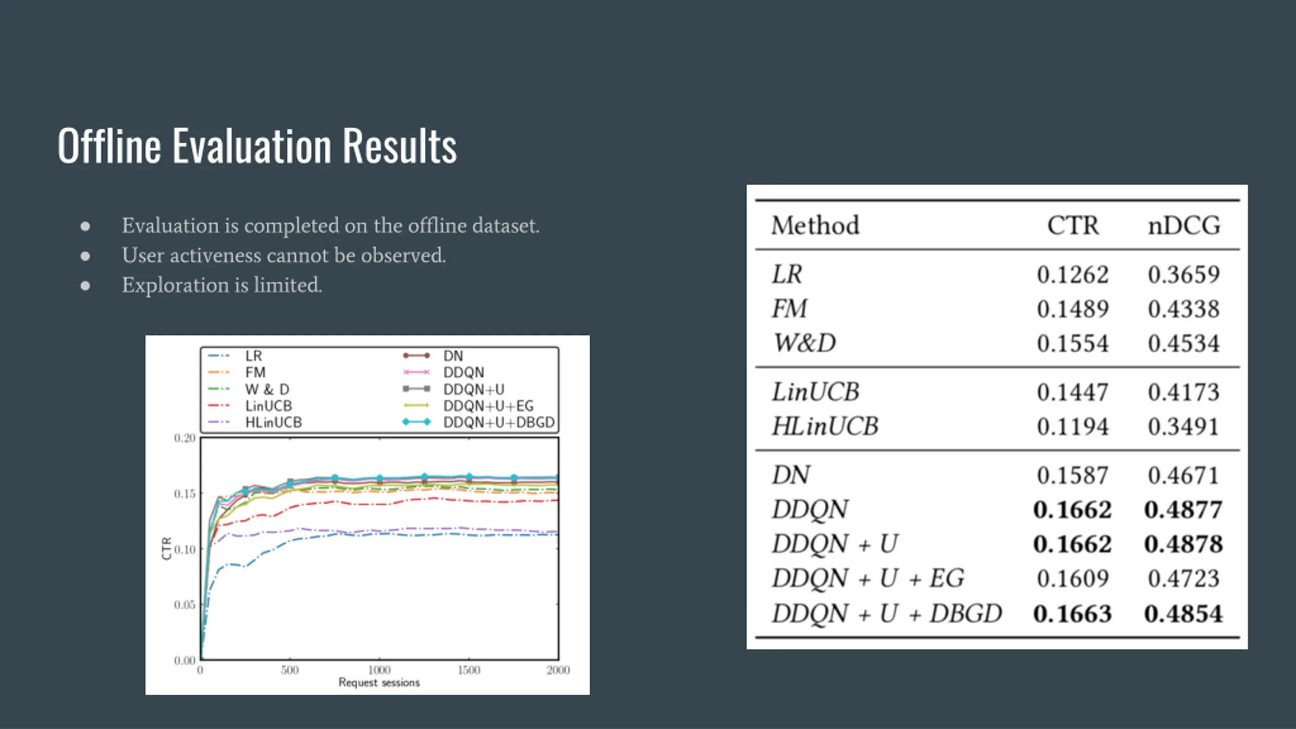 Offline Evaluation Results Evaluation is completed on the offline dataset. User activeness cannot be observed. Exploration is limited.