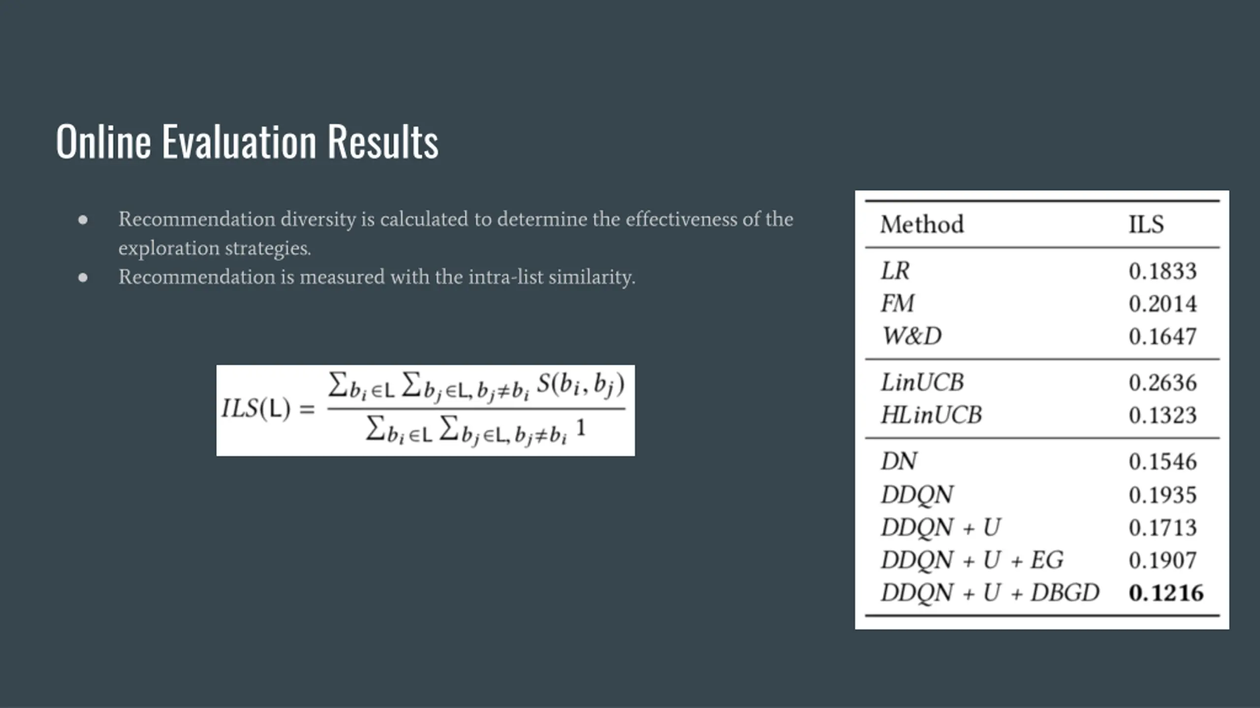 Online Evaluation Results Recommendation diversity is calculated to determine the effectiveness of the exploration strategies. Recommendation is measured with the intra-list similarity.