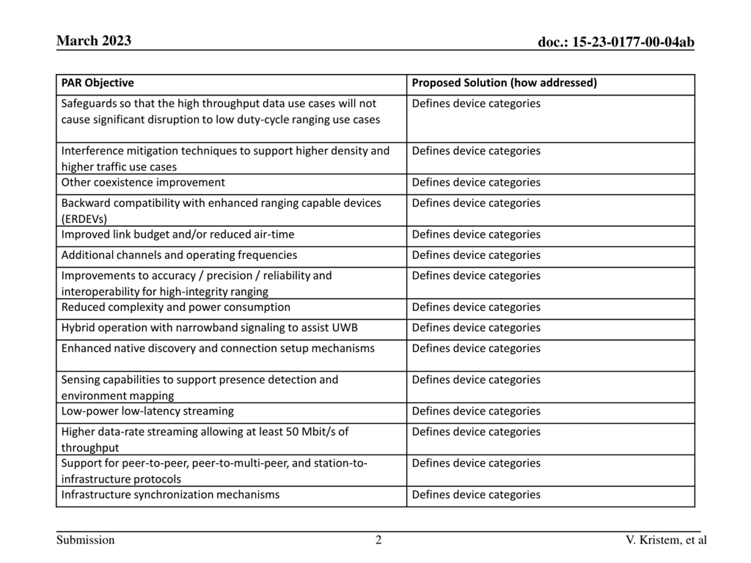 March 2023 doc.: 15-23-0177-00-04ab PAR Objective Proposed Solution (how addressed) Safeguards so that the high throughput data use cases will not cause significant disruption to low duty-cycle ranging use cases Defines device categories Interference mitigation techniques to support higher density and higher traffic use cases Other coexistence improvement Defines device categories Defines device categories Backward compatibility with enhanced ranging capable devices (ERDEVs) Improved link budget and/or reduced air-time Defines device categories Defines device categories Additional channels and operating frequencies Defines device categories Improvements to accuracy / precision / reliability and interoperability for high-integrity ranging Reduced complexity and power consumption Defines device categories Defines device categories Hybrid operation with narrowband signaling to assist UWB Defines device categories Enhanced native discovery and connection setup mechanisms Defines device categories Sensing capabilities to support presence detection and environment mapping Low-power low-latency streaming Defines device categories Defines device categories Higher data-rate streaming allowing at least 50 Mbit/s of throughput Support for peer-to-peer, peer-to-multi-peer, and station-to- infrastructure protocols Infrastructure synchronization mechanisms Defines device categories Defines device categories Defines device categories Submission 2 V. Kristem, et al
