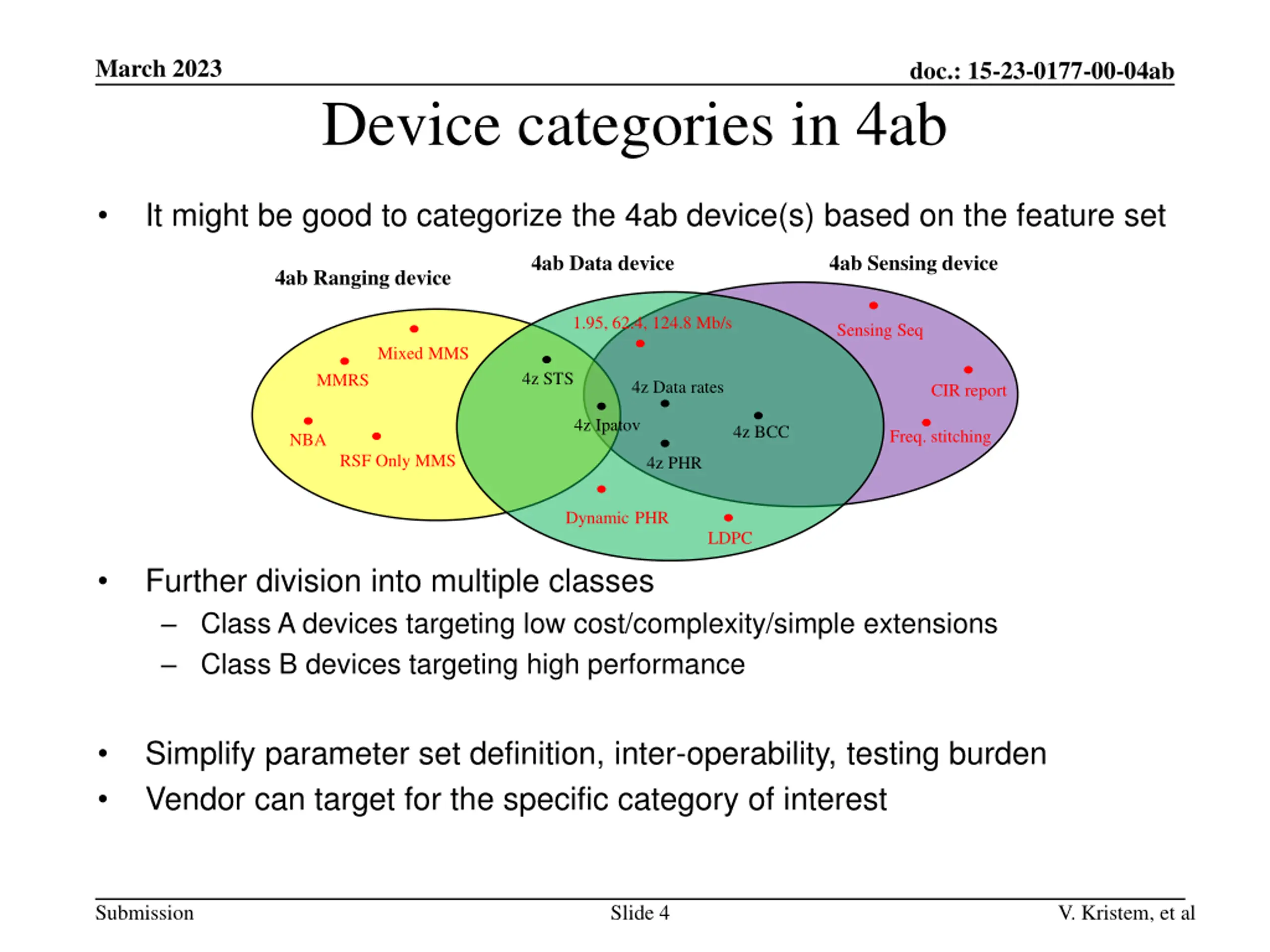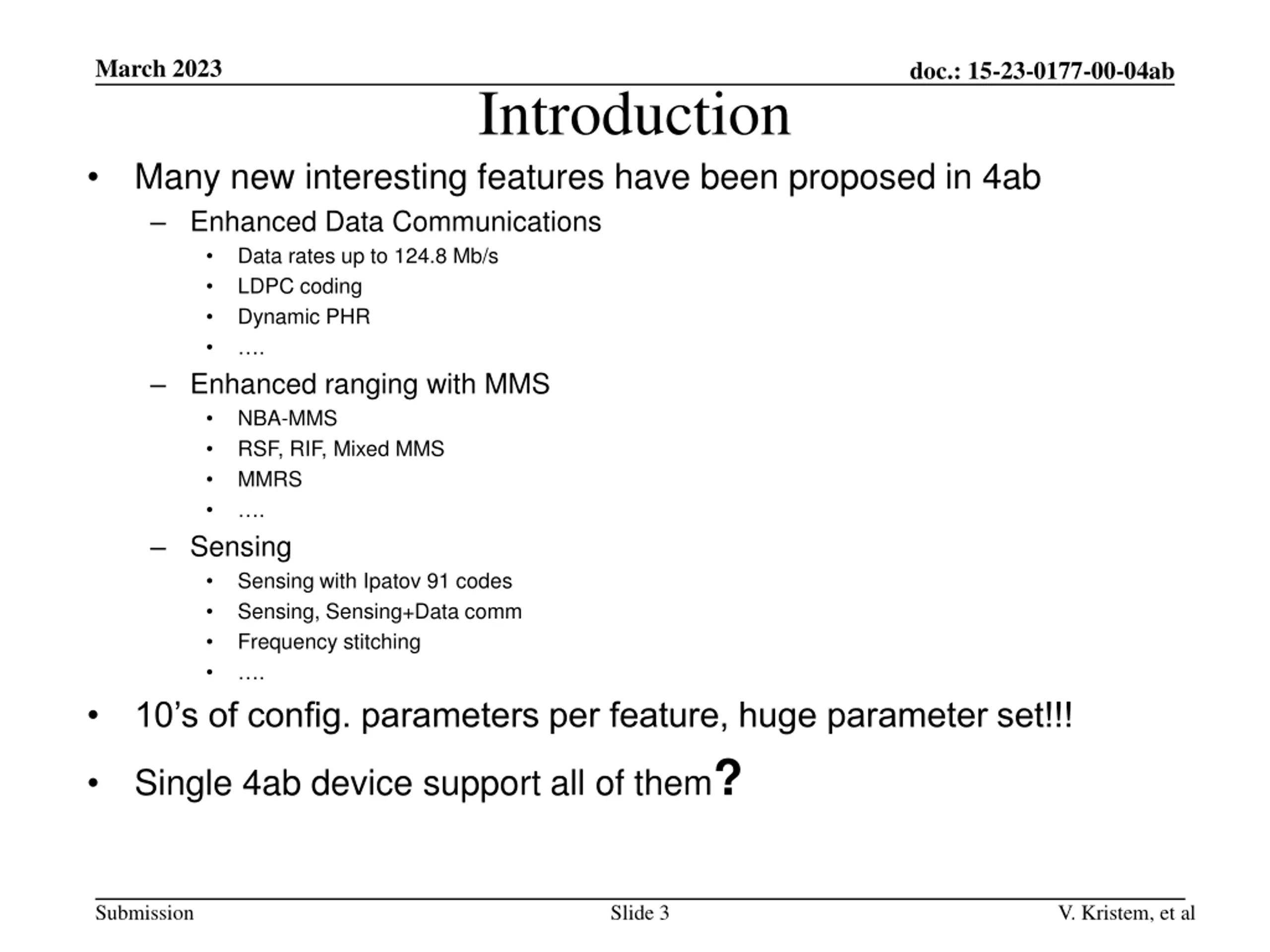 March 2023 doc.: 15-23-0177-00-04ab Introduction Many new interesting features have been proposed in 4ab Enhanced Data Communications Data rates up to 124.8 Mb/s LDPC coding Dynamic PHR . Enhanced ranging with MMS NBA-MMS RSF, RIF, Mixed MMS MMRS . Sensing Sensing with Ipatov 91 codes Sensing, Sensing+Data comm Frequency stitching . 10 s of config. parameters per feature, huge parameter set!!! Single 4ab device support all of them? Submission Slide 3 V. Kristem, et al