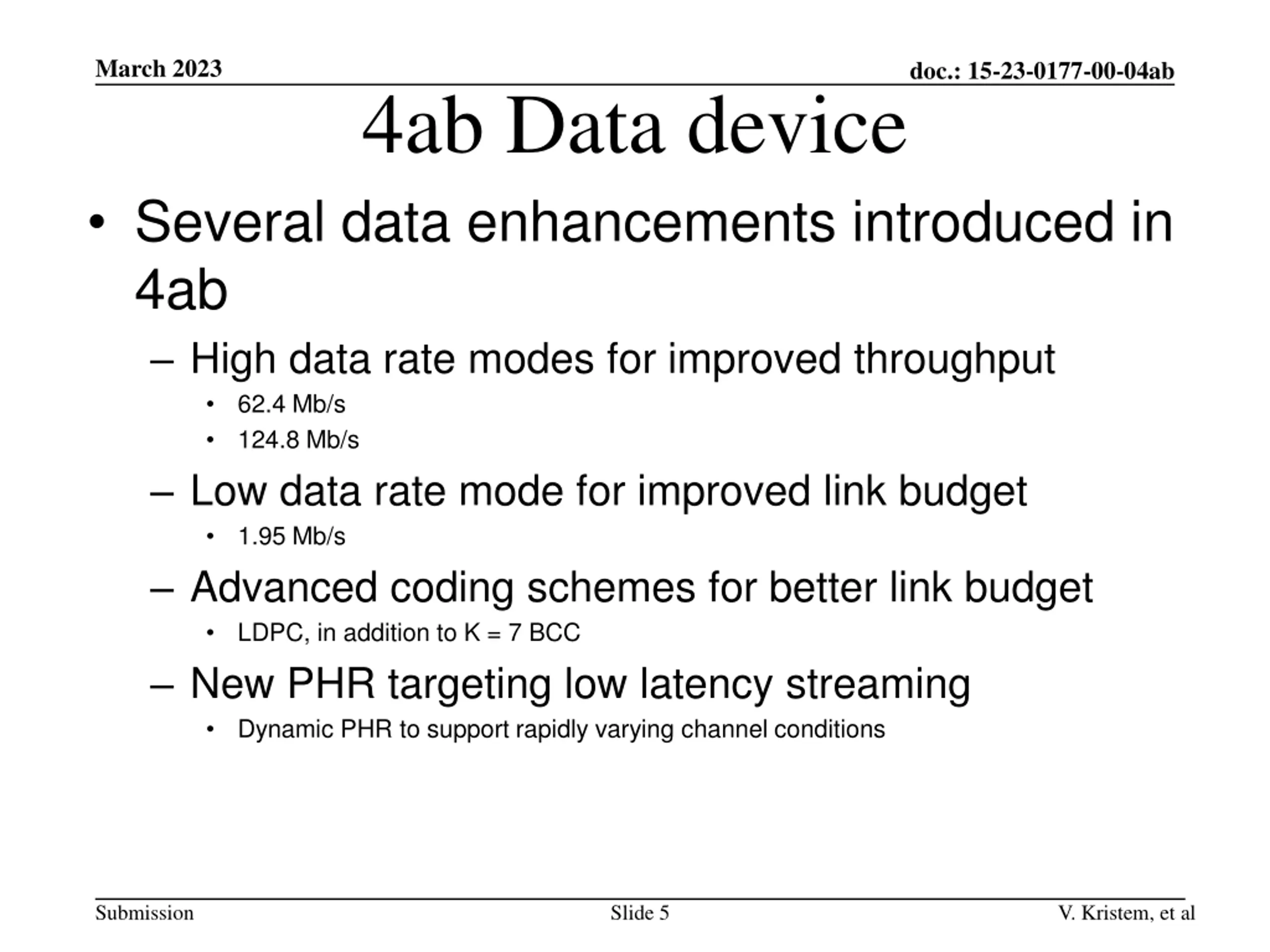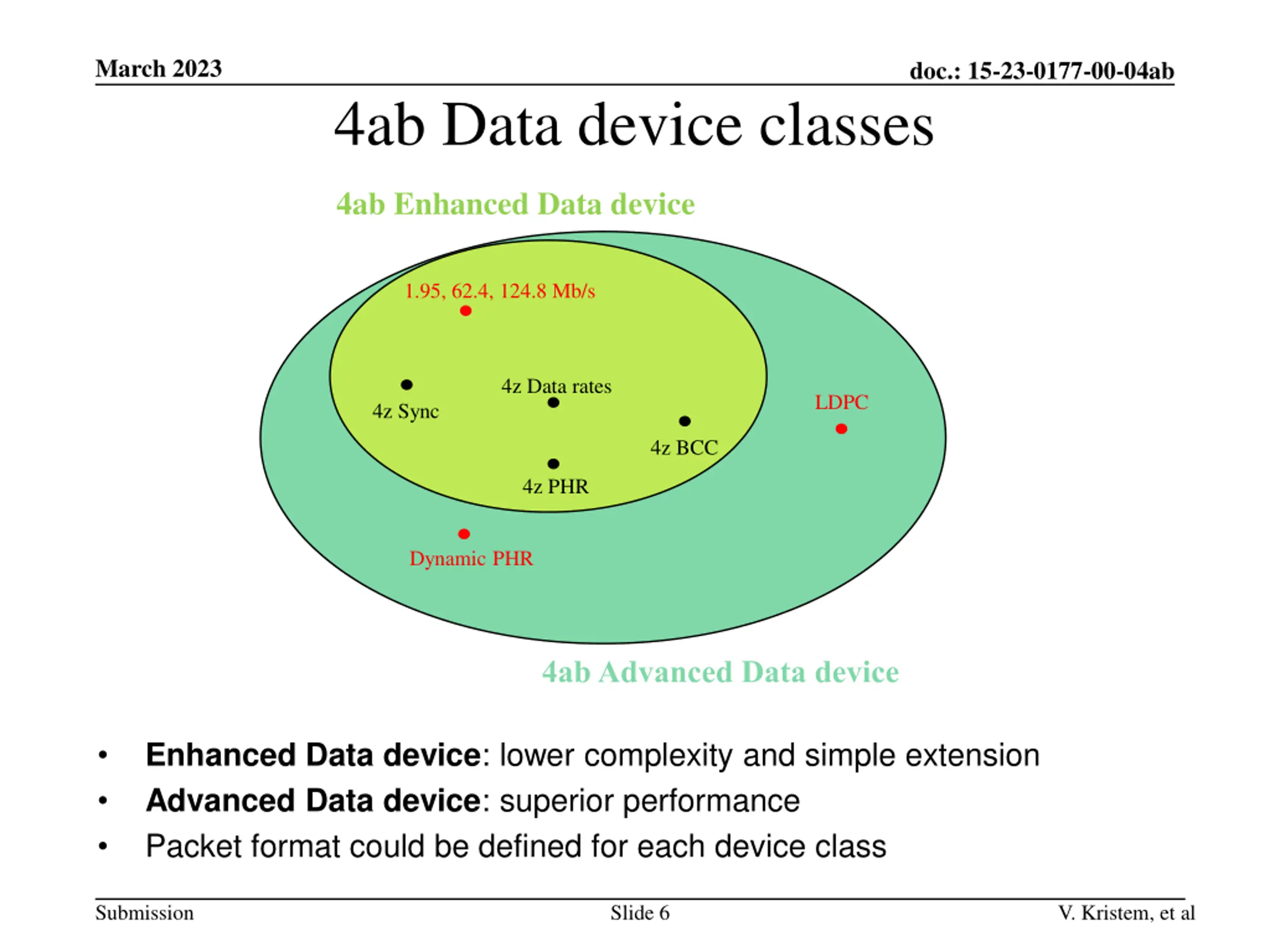 March 2023 doc.: 15-23-0177-00-04ab 4ab Data device Several data enhancements introduced in 4ab High data rate modes for improved throughput 62.4 Mb/s 124.8 Mb/s Low data rate mode for improved link budget 1.95 Mb/s Advanced coding schemes for better link budget LDPC, in addition to K = 7 BCC New PHR targeting low latency streaming Dynamic PHR to support rapidly varying channel conditions Submission Slide 5 V. Kristem, et al