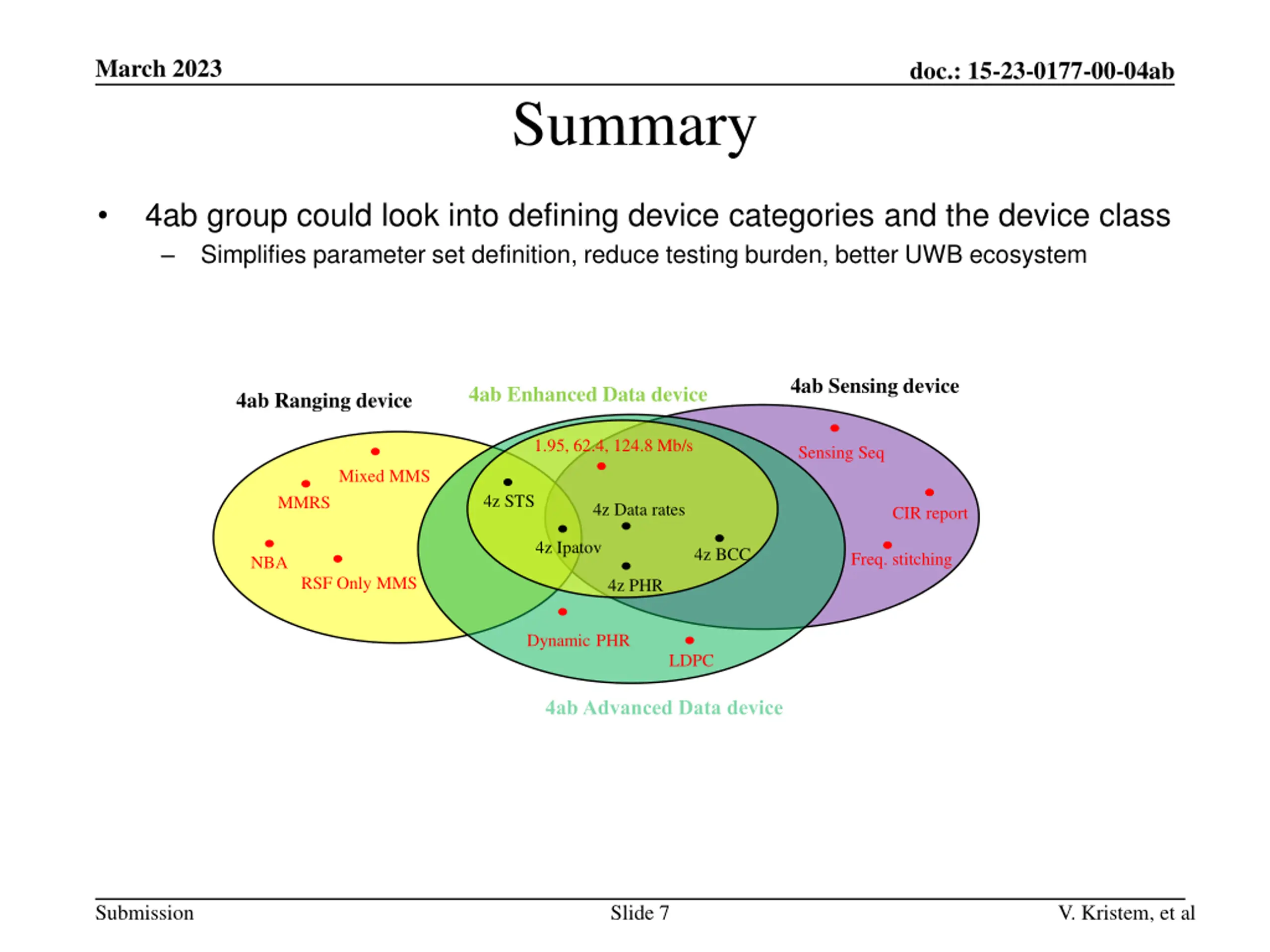 March 2023 doc.: 15-23-0177-00-04ab 4ab Data device classes 4ab Enhanced Data device 1.95, 62.4, 124.8 Mb/s 4z Data rates LDPC 4z Sync 4z BCC 4z PHR Dynamic PHR Enhanced Data device: lower complexity and simple extension Advanced Data device: superior performance Packet format could be defined for each device class Submission Slide 6 V. Kristem, et al